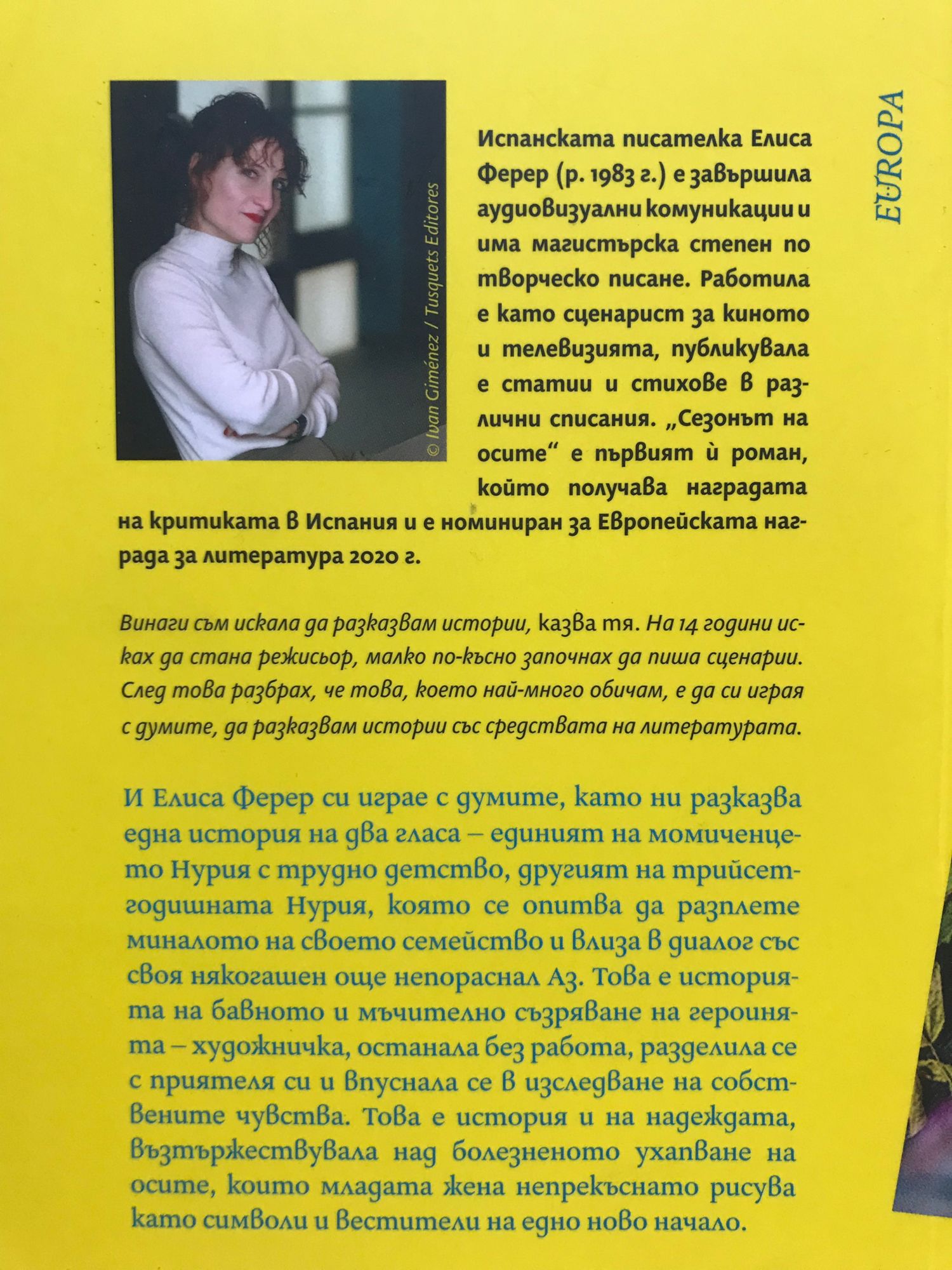 Винаги съм искала да разказвам истории, казва тя. На 14 години исках да стана режисьор, малко по-късно започнах да пиша сценарии. След това разбрах, че това, което най-много обичам, е да си играя с думите, да разказвам истории със средствата на литературата. И Елиса Ферер си играе с думите, като ни разказва една история на два гласа – единият на момиченцето Нурия с трудно детство, другият на трийсетгодишната Нурия, която се опитва да разплете миналото на своето семейство и влиза в диалог със своя някогашен още непораснал Аз. Това е историята на бавното и мъчително съзряване на героинята – художничка, останала без работа, разделила се с приятеля си и впуснала се в изследване на собствените чувства. Това е история и на надеждата, възтържествувала над болезненото ухапване на осите, които младата жена непрекъснато рисува като символи и вестители на едно ново начало.