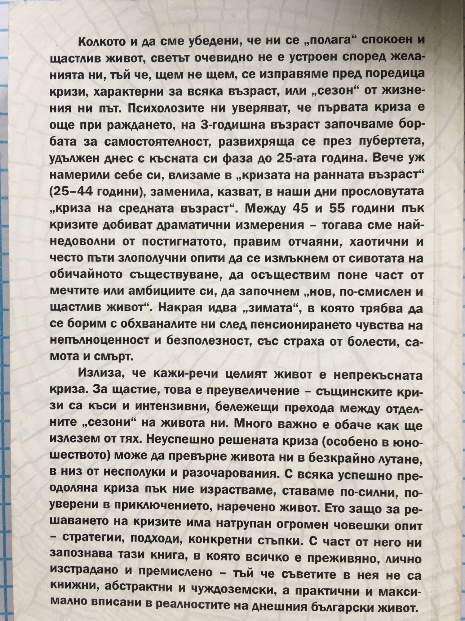 Колкото и да сме убедени, че ни се “полага” спокоен и щастлив живот, светът очевидно не е устроен според желанията ни, тъй че, щем не щем, се изправяме пред поредица кризи, характерни за всяка възраст, или “сезон” от жизнения ни път. Психолозите ни уверяват, че първата криза е още при раждането, на 3-годишна възраст започваме борбата за самостоятелност, развихряща се през пубертета, удължен днес с късната си фаза до 25-тата година. Вече уж намерили себе си, влизаме в “кризата на ранната възраст” (25-44 години), заменила, казват, в наши дни прословутата “криза на средната възраст”. Между 45 и 55 години пък кризите добиват драматични измерения - тогава сме най-недоволни от постигнатото, правим отчаяни, хаотични и често пъти злополучни опити да се измъкнем от сивотата на обичайното съществуване, да осъществим поне част от мечтите или амбициите си, да започнем “нов, по-смислен и щастлив живот”. Накрая идва “зимата”, в която трябва да се борим с обхваналите ни след пенсионирането чувства на непълноценност и безполезност, със страха от болести, самота и смърт. Излиза, че кажи-речи целият живот е непрекъсната криза. За щастие, това е преувеличение - същинските кризи са къси и интензивни, бележещи прехода между отделните “сезони” на живота ни. Много важно е обаче как ще излезем от тях. Неуспешно решената криза (особено в юношеството) може да превърне живота ни в безкрайно лутане, в низ от несполуки и разочарования. С всяка успешно преодоляна криза пък ние израстваме, ставаме по-силни, по-уверени в приключението, наречено живот. Ето защо за решаването на кризите има натрупан огромен човешки опит - стратегии, подходи, конкретни стъпки. С част от него ни запознава тази книга, в която всичко е преживяно, лично изстрадано и премислено - тъй че съветите в нея не са книжни, абстрактни и чуждоземски, а практични и максимално вписани в реалностите на днешния български живот.