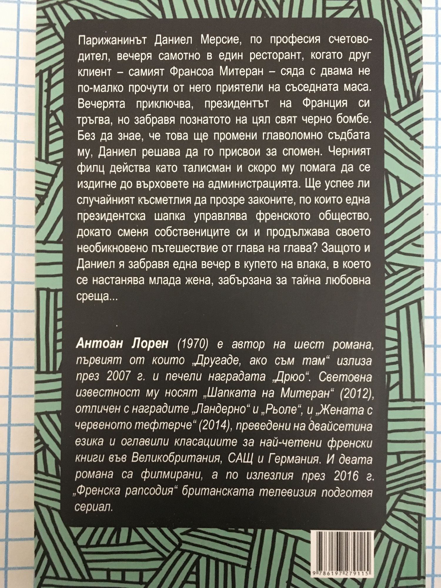 Антоан Лорен (1970) е автор на шест романа, първият от които „Другаде, ако съм там“ излиза през 2007 г. и печели наградата „Дрюо“. Световна известност му носят „Шапката на Митеран“ (2012), отличен с наградите „Ландерно“ и „Рьоле“, и „Жената с червеното тефтерче“ (2014), преведени на двайсетина езика и оглавили класациите за най-четени френски книги във Великобритания, САЩ и Германия. И двата романа са филмирани, а по излезлия през 2016 г. „Френска рапсодия“ британската телевизия подготвя сериал. Парижанинът Даниел Мерсие, по професия счетоводител, вечеря самотно в един ресторант, когато друг клиент - самият Франсоа Митеран - сяда с двама не по-малко прочути от него приятели на съседната маса. Вечерята приключва, президентът на Франция си тръгва, но забравя познатото на цял свят черно бомбе. Без да знае, че това ще промени главоломно съдбата му, Даниел решава да го присвои за спомен. Черният филц действа като талисман и скоро му помага да се издигне до върховете на администрацията. Ще успее ли случайният късметлия да прозре законите, по които една президентска шапка управлява френското общество, докато сменя собствениците си и продължава своето необикновено пътешествие от глава на глава? Защото и Даниел я забравя една вечер в купето на влака, в което се настанява млада жена, забързана за тайна любовна среща...