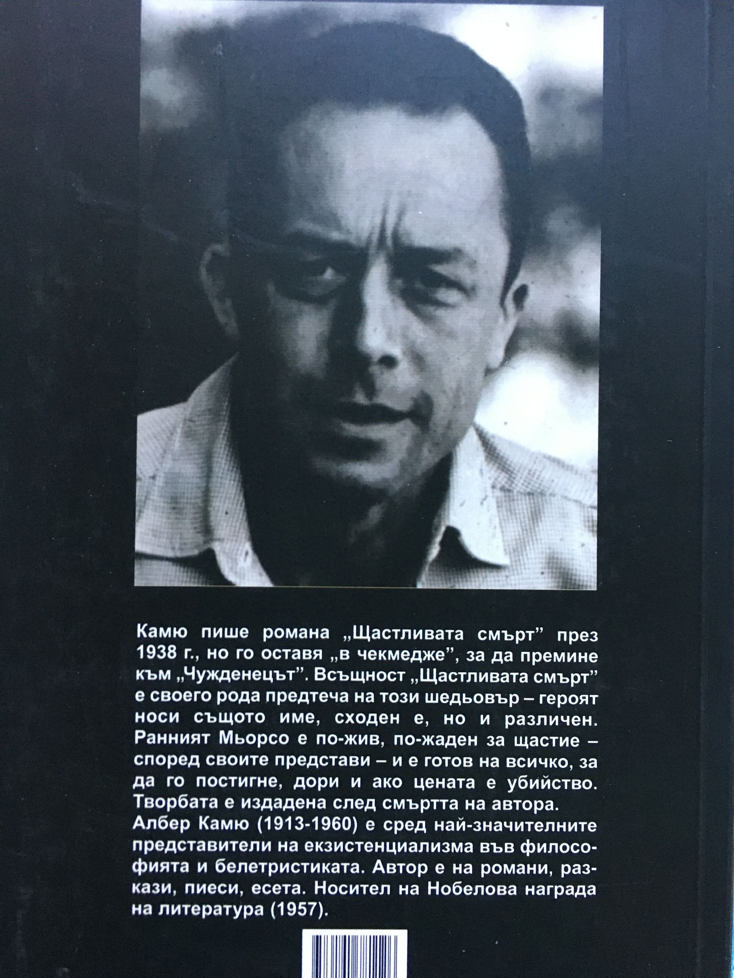 Албер Камю (1913 - 1960) е сред най-значителните представители на екзистенциализма във философията и белетристиката. Автор е на романи, разкази, пиеси, есета. Носител на Нобелова награда на литература (1957). Камю пише романа "Щастливата смърт" през 1938 г., но го оставя в "чекмедже", за да премине към "Чужденецът". Всъщност "Щастливата смърт" е своего рода предтеча на този шедьовър - героят носи същото име, сходен е, но и различен. Ранният Мьорсо е по-жив, по-жаден за щастие - според своите представи - и е готов на всичко, за да го постигне, дори и ако цената е убийство. Творбата е издадена след смъртта на автора.
