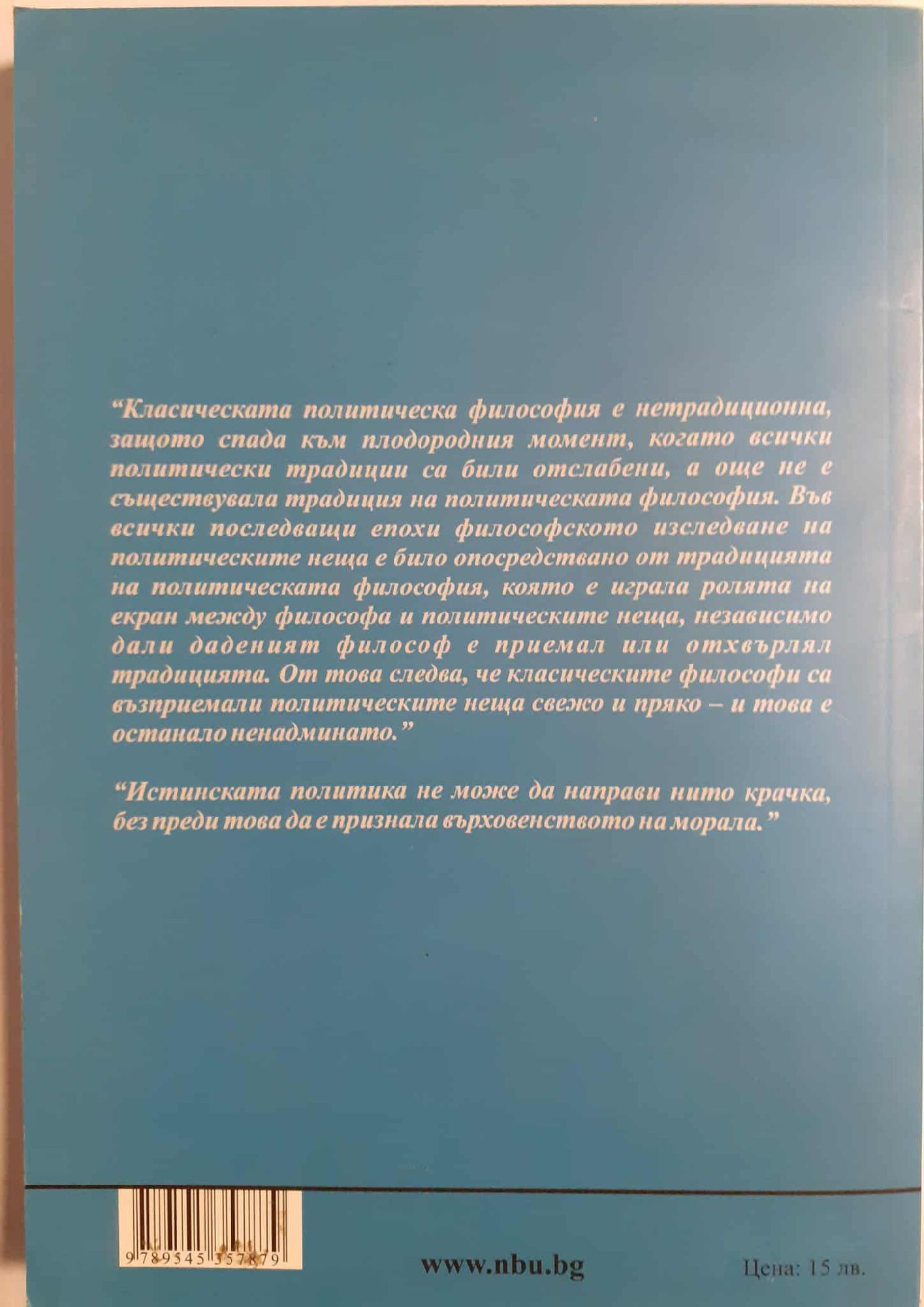 “Класическата политическа философия е нетрадиционна, защото спада към плодородния момент, когато всички политически традиции са били отслабени, а още не е съществувала традиция на политическата философия. Във всички последващи епохи философското изследване на политическите неща е било опосредствано от традицията на политическата философия, която е играла ролята на екран между философа и политическите неща, независимо дали даденият философ е приемал или отхвърлял традицията. От това следва, че класическите философи са възприемали политическите неща свежо и пряко – и това е останало ненадминато. “Истинската политика не може да направи нито крачка, без преди това да е признала върховенството на морала.”