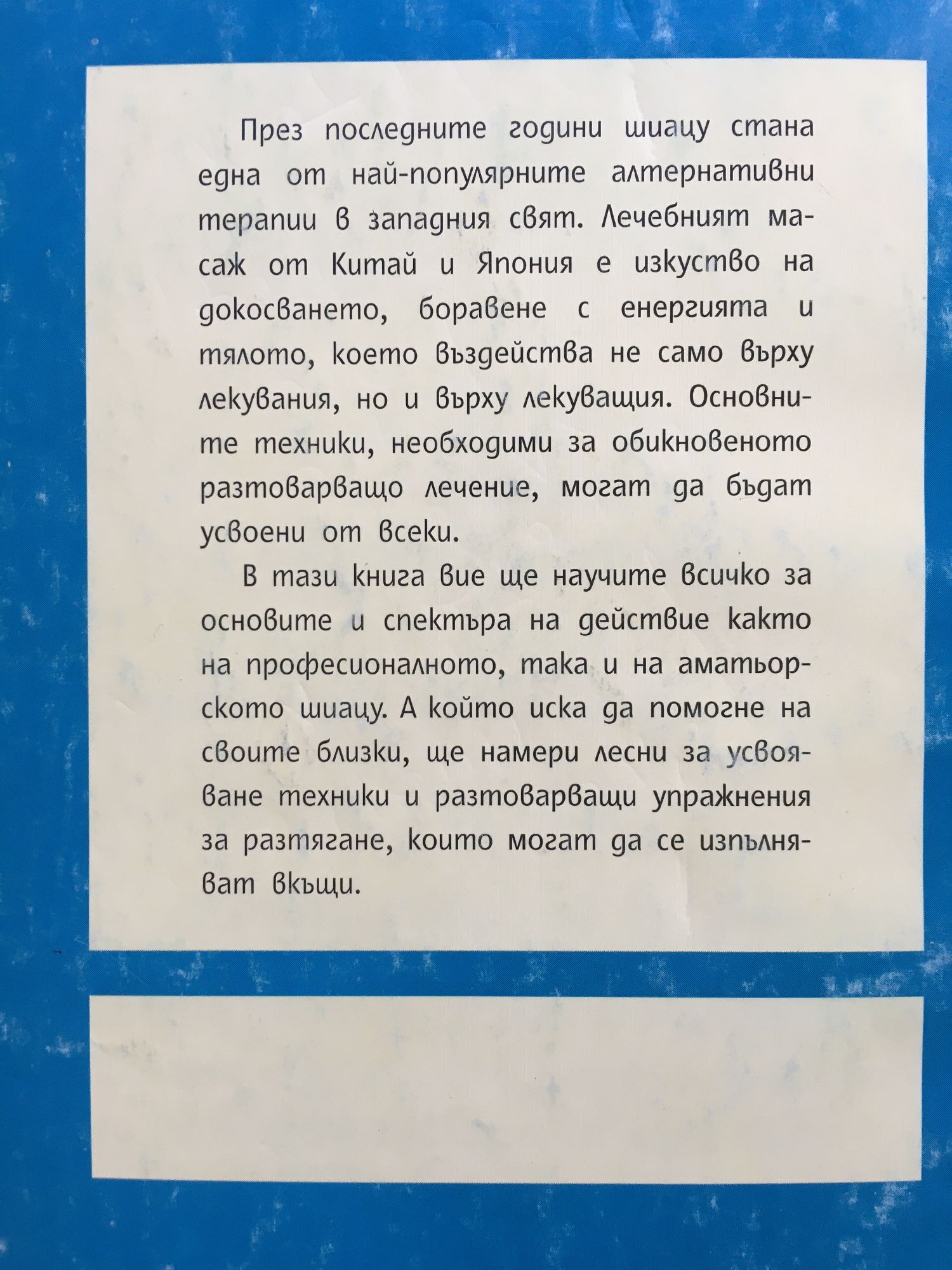 През последните години шиацу стана една от най-популярните алтернативни терапии в западния свят. Лечебният масаж от Китай и Япония е изкуство на докосването, боравене с енергията и тялото, което въздейства не само върху лекувания, но и върху лекуващия. Основните техники, необходими за обикновеното разтоварващо лечение, могат да бъдат усвоени от всеки. В тази книга вие ще научите всичко за основите и спектъра на действие както на професионалното, така и на аматьорското шиацу. А който иска да помогне на своите близки, ще намери лесни за усвояване техники и разтоварващи упражнения за разтягане, които могат да се изпълняват вкъщи.