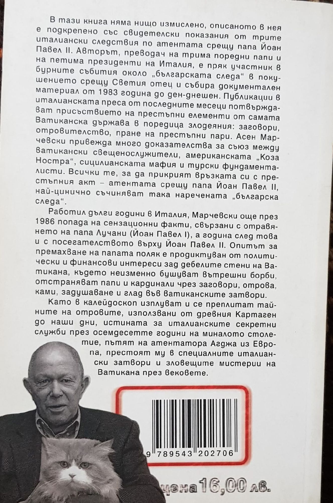 В тази книга няма нищо измислено, описаното в нея е подкрепено със свидетелски показания от трите италиански следствия по атентата срещу папа Йоан Павел ІІ. Авторът, преводач на трима поредни папи и на петима президенти на Италия, е пряк участник в бурните събития около "българската следа" в покушението срещу Светия отец и събира документален материал от 1983 година до ден-днешен. Публикации в италианската преса от последните месеци потвърждават присъствието на престъпни елементи от самата Ватиканска държава в поредица злодеяния: заговори, отровителство, пране на престъпни пари. Асен Марчевски привежда много доказателства за съюз между ватикански свещенослужители, американската "Коза Ностра", сицилианската мафия и турски фундаменталисти. Всички те, за да прикрият връзката си с престъпния акт - атентата срещу папа Йоан Павел ІІ, най-цинично съчиняват така наречената "българска следа". Работил дълги години в Италия, Марчевски още през 1986 попада на сензационни факти, свързани с отравянето на папа Лучани (Йоан Павел І), а година след това и с посегателството върху Йоан Павел ІІ. Опитът за премахване на папата поляк е продиктуван от политически и финансови интереси зад дебелите стени на Ватикана, където неизменно бушуват вътрешни борби, отстраняват папи и кардинали чрез заговори, отрова, ками, задушаване и глад във ватиканските затвори. Като в калейдоскоп изплуват и се преплитат тайните на отровите, използвани от древния Картаген до наши дни, истината за италианските секретни служби през осемдесетте години на миналото столетие, пътят на атентатора Агджа из Европа, престоят му в специалните италиански затвори и зловещите мистерии на Ватикана през вековете.
