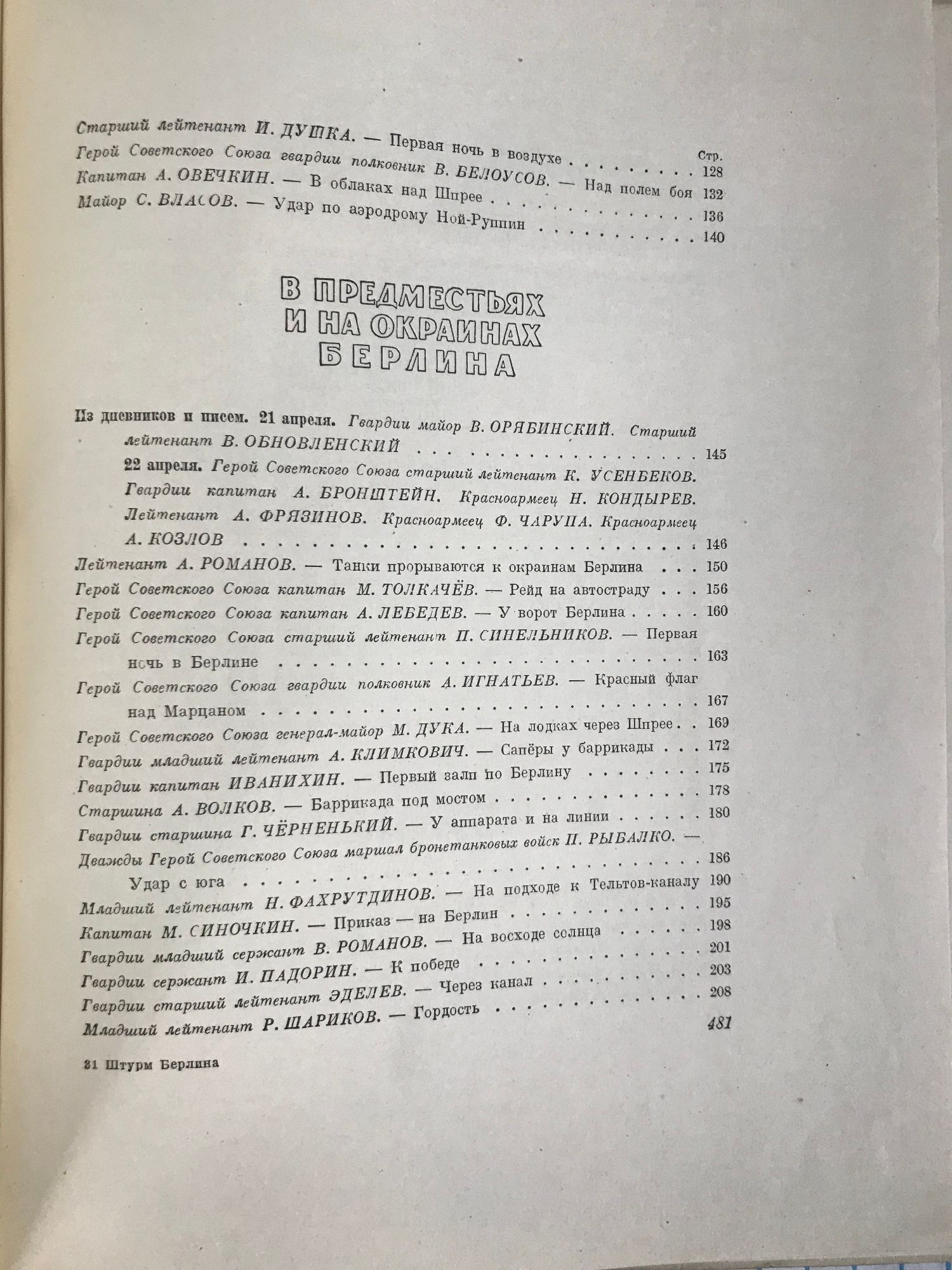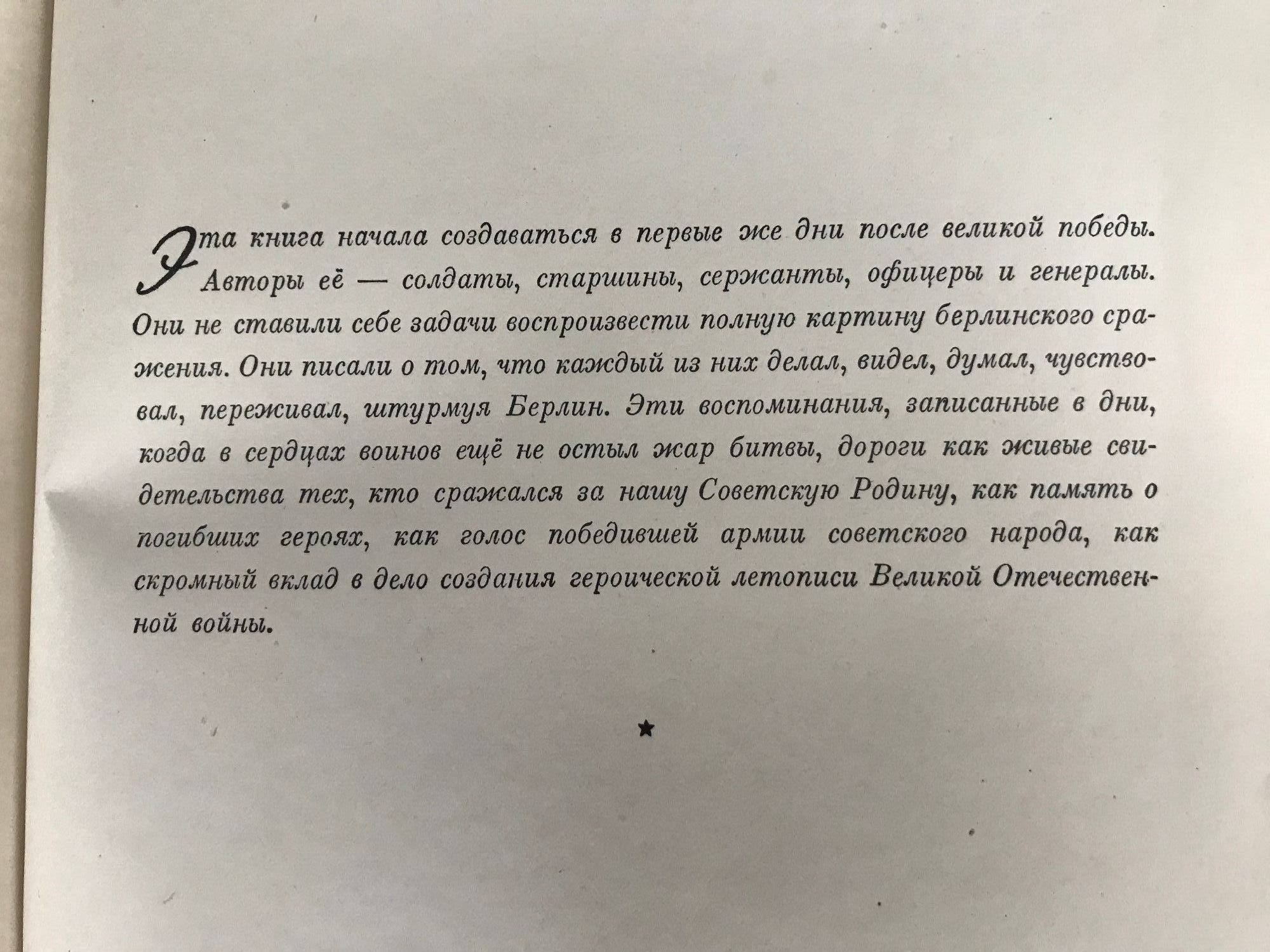 Книга начала создаваться в первые же дни после Великой Победы. Авторы ее – солдаты, старшины, сержанты, офицеры и генералы. Они не ставили себе задачи воспроизвести полную картину Берлинского сражения. Они писали о том, что каждый из них делал, видел, думал, чувствовал, переживал, штурмуя Берлин. Эти воспоминания, записанные в дни, когда в сердцах воинов еще не остыл жар битвы, дороги как живые свидетельства тех, кто сражался за Родину, как память о погибших героях, как голос победившей армии советского народа, как скромный вклад каждого в дело создания героической летописи Великой Отечественной войны.