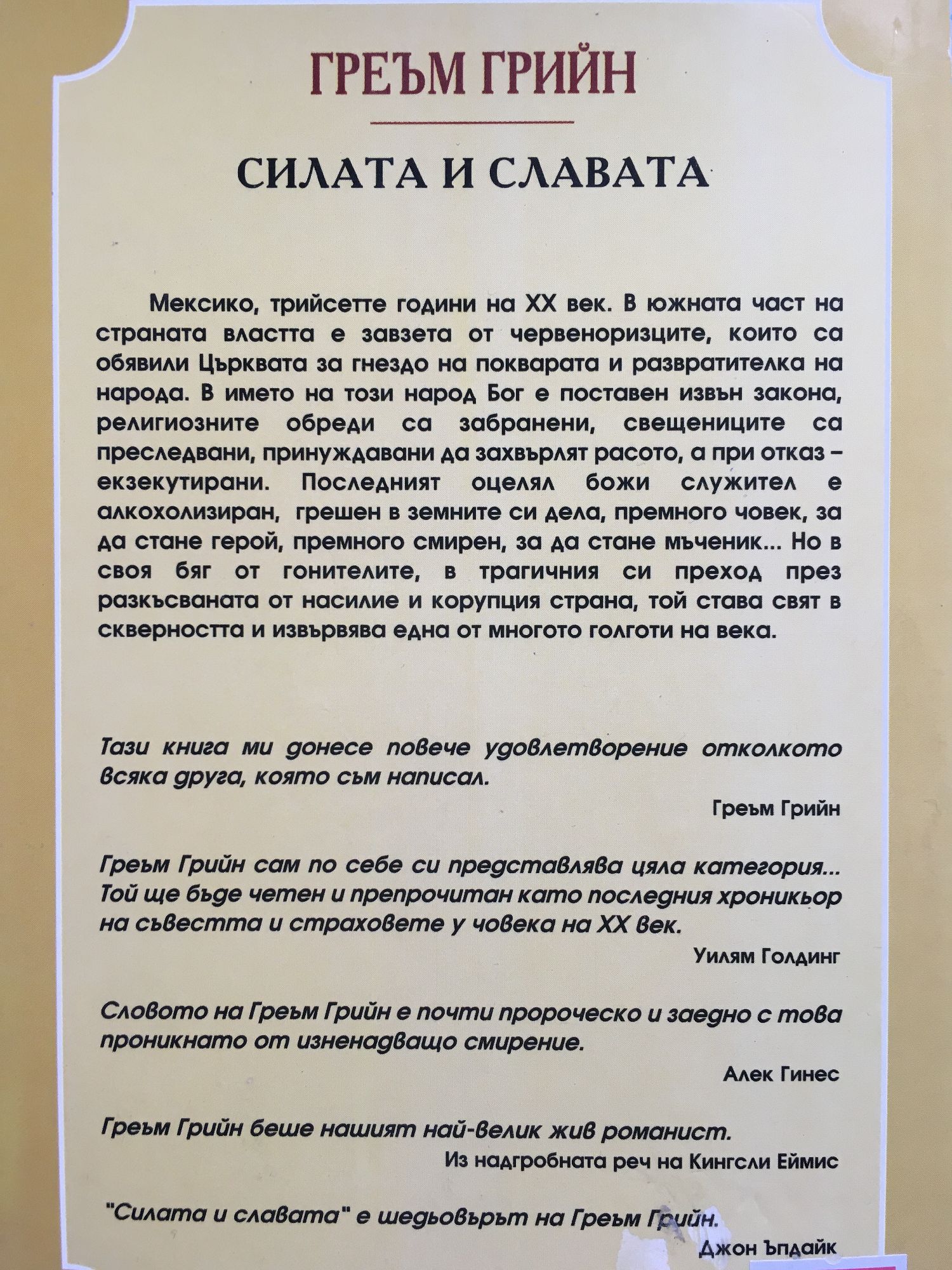Мексико, трийсетте години на XX век. В южната част на страната властта е завзета от червеноризците, които са обявили Църквата за гнездо на покварата и развратителка на народа. В името на този народ Бог е поставен извън закона, религиозните обреди са забранени, свещениците са преследвани, принуждавани да захвърлят расото, а при отказ -екзекутирани. Последният оцелял божи служител е алкохолизиран, грешен в земните си дела, премного човек, за да стане герой, премного смирен, за да стане мъченик... Но в своя бяг от гонителите, в трагичния си преход през разкъсваната от насилие и корупция страна, той става свят в скверността и извървява една от многото голготи на века. Тази книга ми донесе повече удовлетворение отколкото всяка друга, която съм написал. Греъм Грийн Греъм Грийн сам по себе си представлява цяла категория... Той ще бъде четен и препрочитай като последния хроникьор на съвестта и страховете у човека на XX век. Уилям Голдинг Словото на Греьм Грийн е почти пророческо и заедно с това проникнато от изненадващо смирение. Алек Гинес Греьм Грийн беше нашият най-велик жив романист. Из надгробната реч на Кингсли Еймис "Силата и славата" е шедьовърът на Греъм Грийн. Джон Ъпдайк