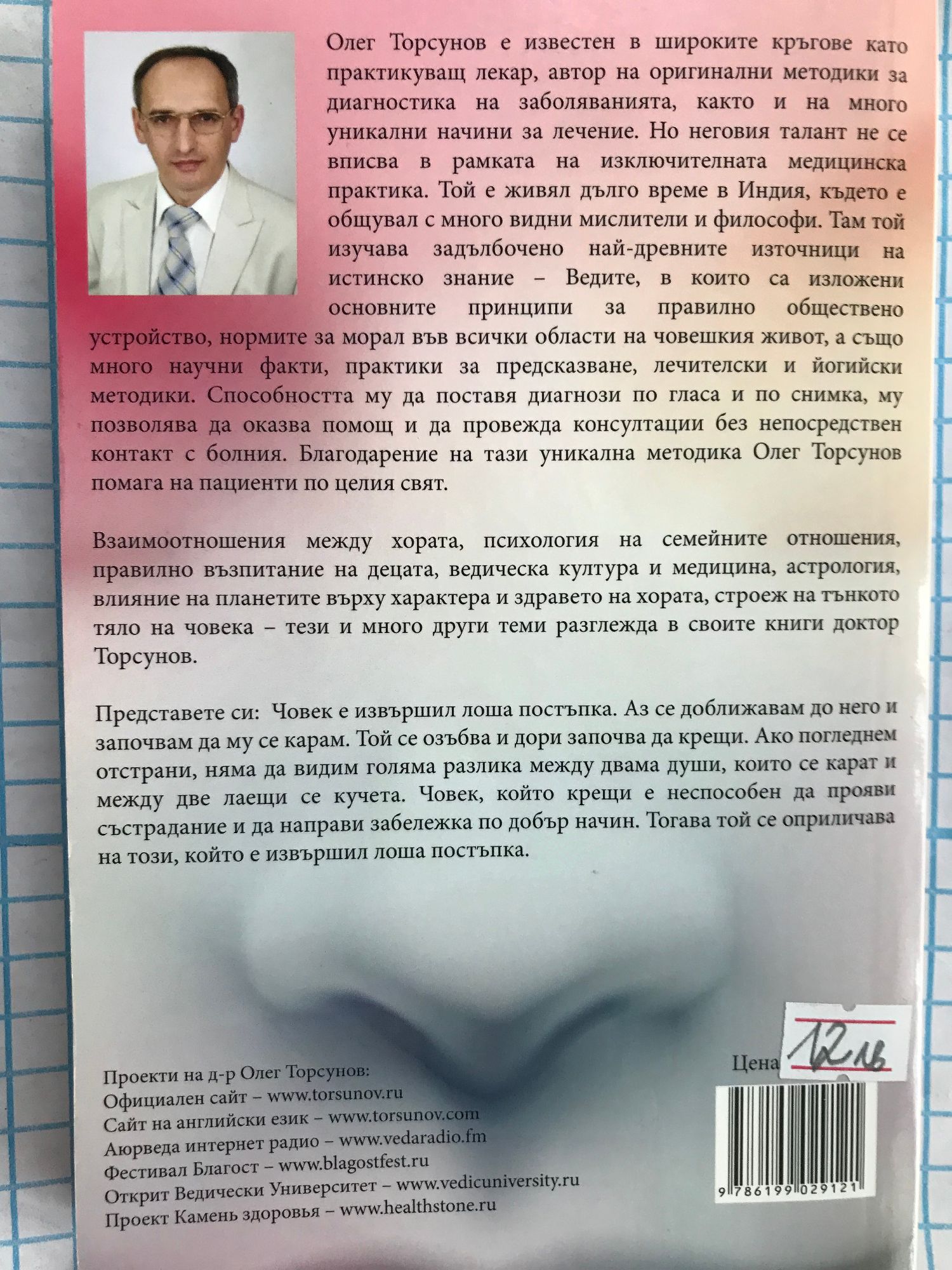 Взаимоотношения между хората, психология на семейните отношения, правилно възпитание на децата, ведическа култура и медицина, астрология, влияние на планетите върху характера и здравето на хората, строеж на тънкото тяло на човека - тези и много други теми разглежда в своите книги доктор Торсунов. Представете си: Човек е извършил лоша постъпка. Аз се доближавам до него и започвам да му се карам. Той се озъбва и дори започва да крещи. Ако погледнем отстрани, няма да видим голяма разлика между двама души, които се карат и между две лаещи се кучета. Човек, който крещи е неспособен да прояви състрадание и да направи забележка по добър начин. Тогава той се оприличава на този, който е извършил лоша постъпка. Олег Торсунов е известен в широките кръгове като практикуващ лекар, автор на оригинални методики за диагностика на заболяванията, както и на много уникални начини за лечение. Но неговият талант не се вписва в рамката на изключителната медицинска практика. Той е живял дълго време в Индия, където е общувал с много видни мислители и философи. Там той изучава задълбочено най-древните източници на истинско знание - Ведите, в които са изложени основните принципи за правилно обществено устройство, нормите за морал във всички области на човешкия живот, а също много научни факти, практики за предсказване, лечителски и йогийски методики. Способността му да поставя диагнози по гласа и по снимка, му позволява да оказва помощ и да провежда консултации без непосредствен контакт с болния. Благодарение на тази уникална методика Олег Торсунов помога на пациенти от целия свят.