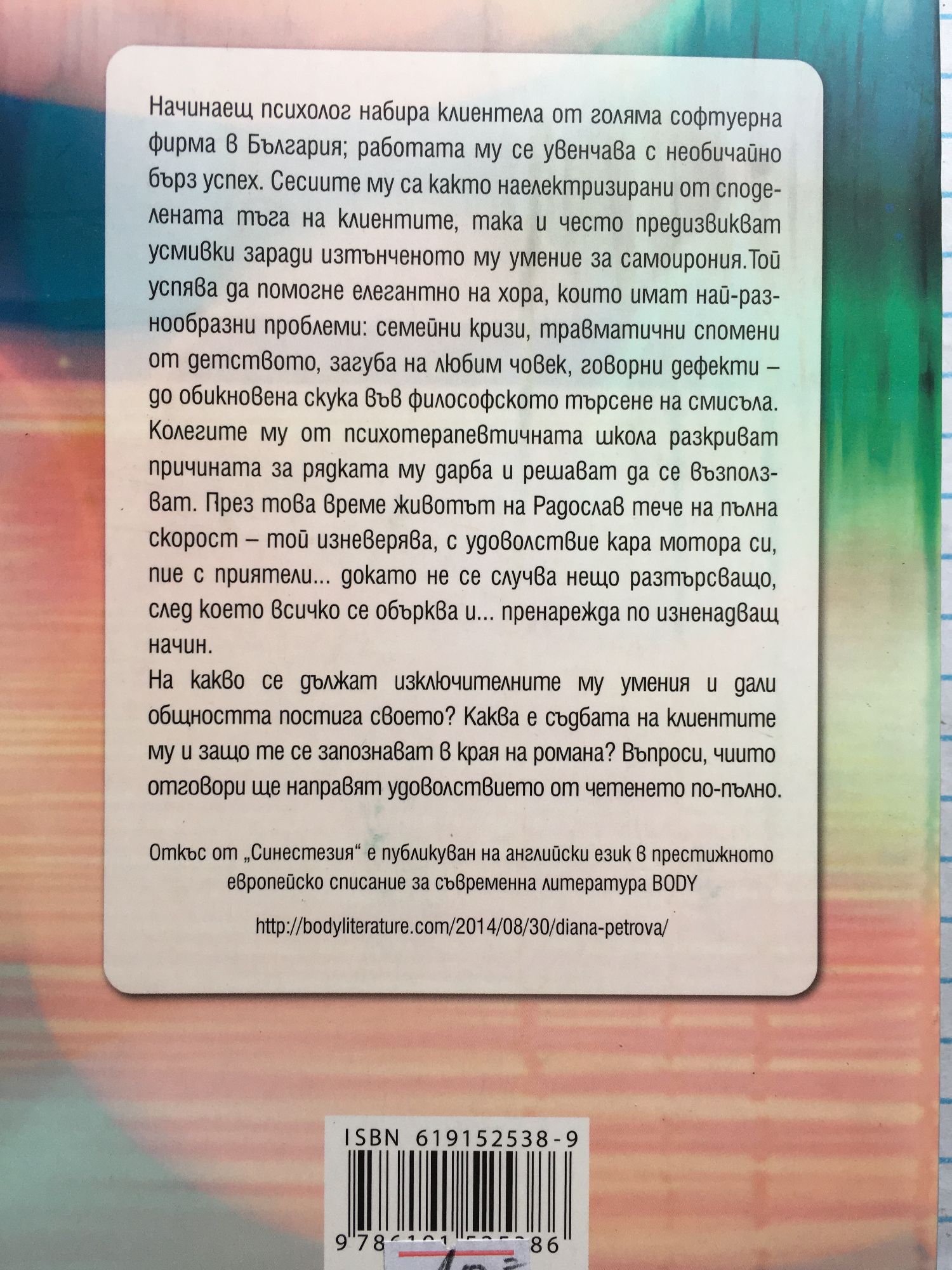 Начинаещ психолог набира клиентела от голяма софтуерна фирма в България; работата му се увенчава с необичайно бърз успех.Сесиите му са както наелектризирани от споделената тъга на клиентите, така и често предизвикват усмивки заради изтънченото му умение за самоирония.Той успява да помогне елегантно на хора, които имат най-разнообразни проблеми: семейни кризи, травматични спомени от детството, загуба на любим човек, говорни дефекти – до обикновена скука във философското търсене на смисъла. Колегите му от психотерапевтичната школа разкриват причината за рядката му дарба и решават да се възползват. През това време животът на Радослав тече пълнокръвно – той изневерява, с удоволствие кара мотора си, пие с приятели... докато не се случва нещо разтърсващо, след което всичко се обърква и... подрежда по изненадващ начин. На какво се дължат изключителните му умения и дали общността постига своето? Каква е съдбата на клиентите му и защо те се запознават в края на романа? Въпроси, чиито отговори ще усладят удоволствието от четенето по-пълно.