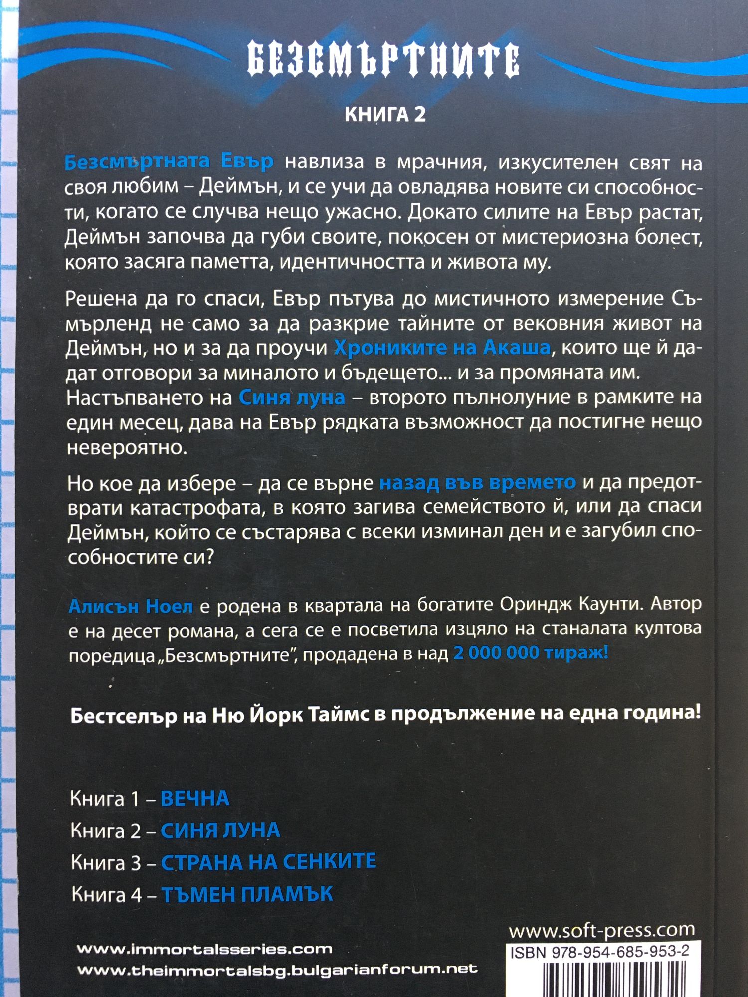 Безсмъртната Евър навлиза в мрачния, изкусителен свят на своя любим – Деймън, и се учи да овладява новите си способности, когато се случва нещо ужасно. Докато силите на Евър растат, Деймън започва да губи своите, покосен от мистериозна болест, която засяга паметта, идентичността и живота му. Решена да го спаси, Евър пътува до мистичното измерение Съмърленд не само за да разкрие тайните от вековния живот на Деймън, но и за да проучи Хрониките на Акаша, които ще й дадат отговори за миналото и бъдещето... и за промяната им. Настъпването на Синя луна – второто пълнолуние в рамките на един месец, дава на Евър рядката възможност да постигне нещо невероятно. Но кое да избере – да се върне назад във времето и да предотврати катастрофата, в която загива семейството й, или да спаси Деймън, който се състарява с всеки изминал ден и е загубил способностите си? Алисън Ноел е родена в квартала на богатите Ориндж Каунти. Автор е на десет романа, а сега се е посветила изцяло на станалата култова поредица "Безсмъртните", продадена в над 2 000 000 тираж! Бестселър на Ню Йорк Таймс в продължение на една година!