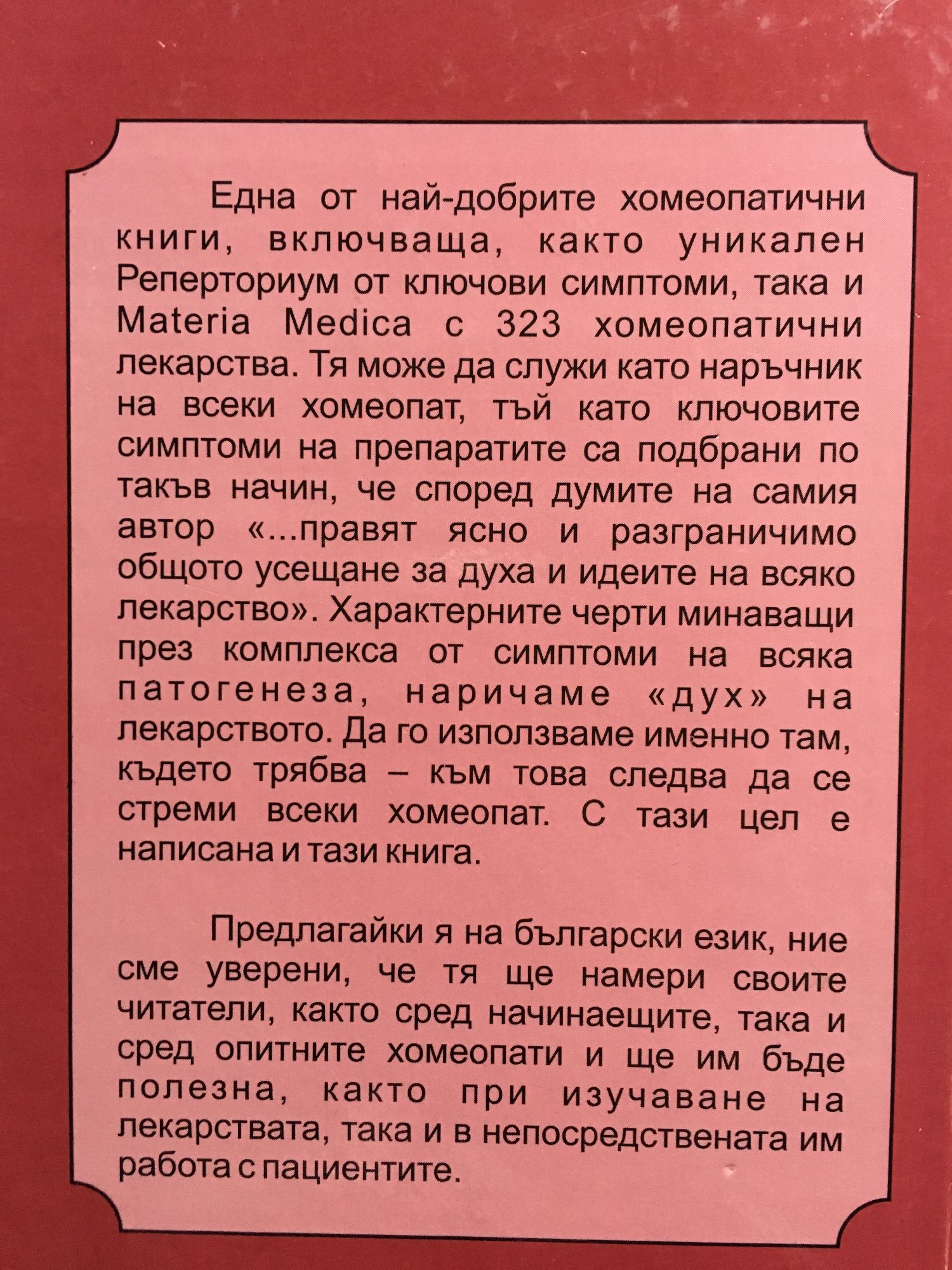Тази книга е на един от класиците на американската хомеопатична школа Сайръс Максуел Богер. Тъй като в нея са представени, както уникален Реперториум от ключови симптоми, така и Materia Medica с 323 хомеопатични лекарства, тя може да служи като наръчник на всеки хомеопат. Още повече, че ключовите симптоми на препаратите са подбрани по такъв начин, че според думите на самия автор: «... правят ясно и разграничимо общото усещане за духа и идеите на всяко лекарство».