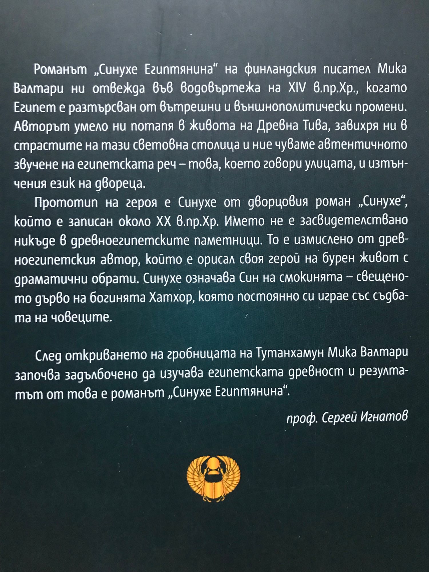 Романът „Синухе Египтянина“ на финландския писател Мика Валтари ни отвежда във водовъртежа на XIV в.пр.Хр., когато Египет е разтърсван от вътрешни и външнополитически промени. Авторът умело ни потапя в живота на Древна Тива, завихря ни в страстите на тази световна столица и ние чуваме автентичното звучене на египетската реч – това, което говори улицата, и изтънчения език на двореца. Прототип на героя е Синухе от дворцовия роман „Синухе“, който е записан около XX в.пр.Хр. Името не е засвидетелствано никъде в древноегипетските паметници. То е измислено от древноегипетския автор, който е орисал своя герой на бурен живот с драматични обрати. Синухе означава Син на смокинята – свещеното дърво на богинята Хатхор, която постоянно си играе със съдбата на човеците. След откриването на гробницата на Тутанхамун Мика Валтари започва задълбочено да изучава египетската древност и резултатът от това е романът „Синухе Египтянина“. проф. Сергей Игнатов