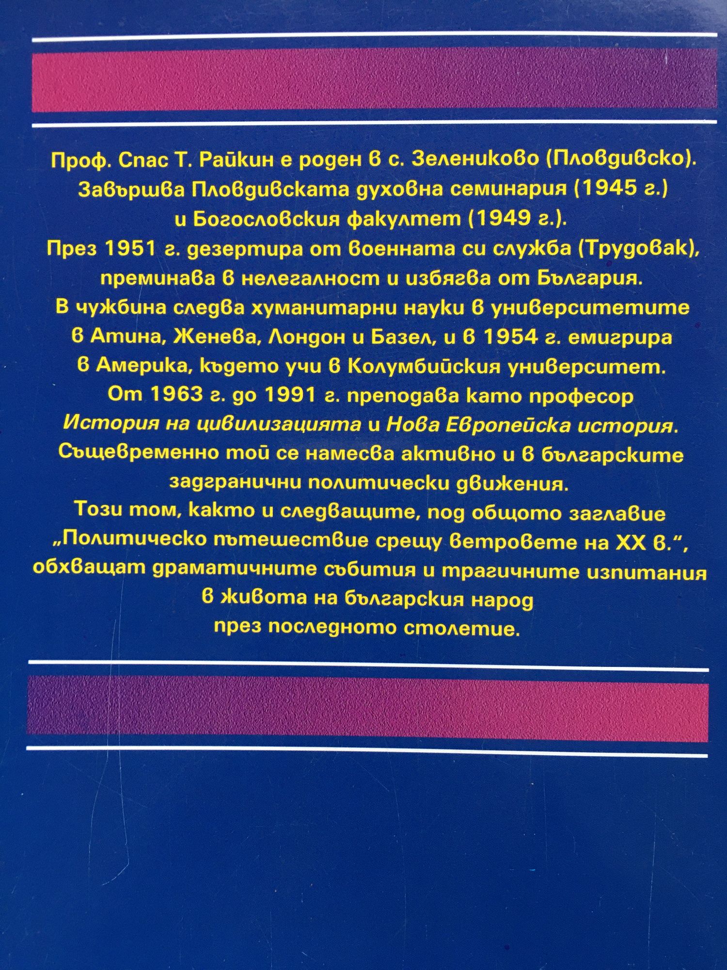 Проф. Спас Т. Райкин е роден в с. Зелениково (Пловдивско). Завършва Пловдивската духовна семинария (1945 г.) и Богословския факултет (1949 г.). През 1951 г. дезертира от военната си служба (Трудовак), преминава в нелегалност и избягва от България. В чужбина следва хуманитарни науки в университетите в Атина, Женева, Лондон и Базел, и в 1954 г. емигрира в Америка, където учи в Колумбийския университет. От 1963 г. до 1991 г. преподава като професор "История на цивилизацията" и "Нова Европейска история". Същевременно той се намесва активно и в българските задгранични политически движения. Този том, както и следващите, под общото заглавие "Политическо пътешествие срещу ветровете на ХХ в.", обхваща драматичните събития и трагичните изпитания в живота на българския народ през последното столетие.