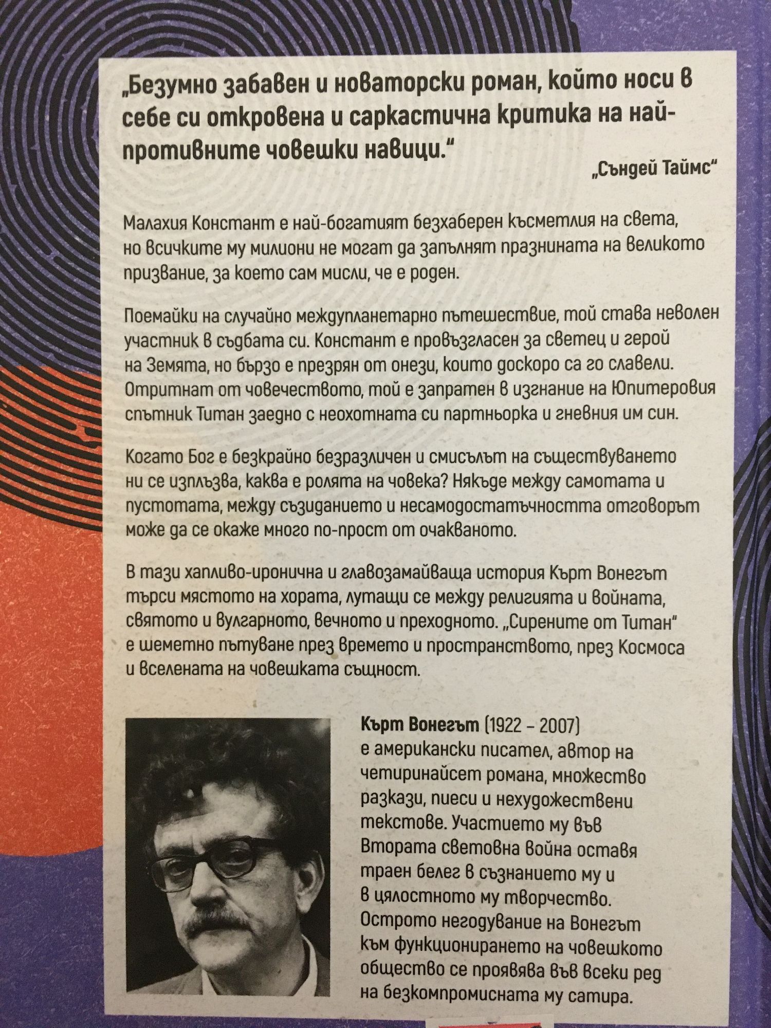 „Безумно забавeн и новаторски роман, който носи в себе си откровена и саркастична критика на най-противните човешки навици.“ „Съндей Таймс“ Малахия Констант е най-богатият безхаберен късметлия на света, но всичките му милиони не могат да запълнят празнината на великото призвание, за което сам мисли, че е роден. Поемайки на случайно междупланетарно пътешествие, той става неволен участник в съдбата си. Констант е провъзгласен за светец и герой на Земята, но бързо е презрян от онези, които доскоро са го славели. Отритнат от човечеството, той е запратен в изгнание на Юпитеровия спътник Титан заедно с неохотната си партньорка и гневния им син. Когато Бог е безкрайно безразличен и смисълът на съществуването ни се изплъзва, каква е ролята на човека? Някъде между самотата и пустотата, между съзиданието и несамодостатъчността отговорът може да се окаже много по-прост от очакваното. В тази хапливо-иронична и главозамайваща история Кърт Вонегът търси мястото на хората, лутащи се между религията и войната, святото и вулгарното, вечното и преходното. „Сирените от Титан“ е шеметно пътуване през времето и пространството, през Космоса и вселената на човешката същност.