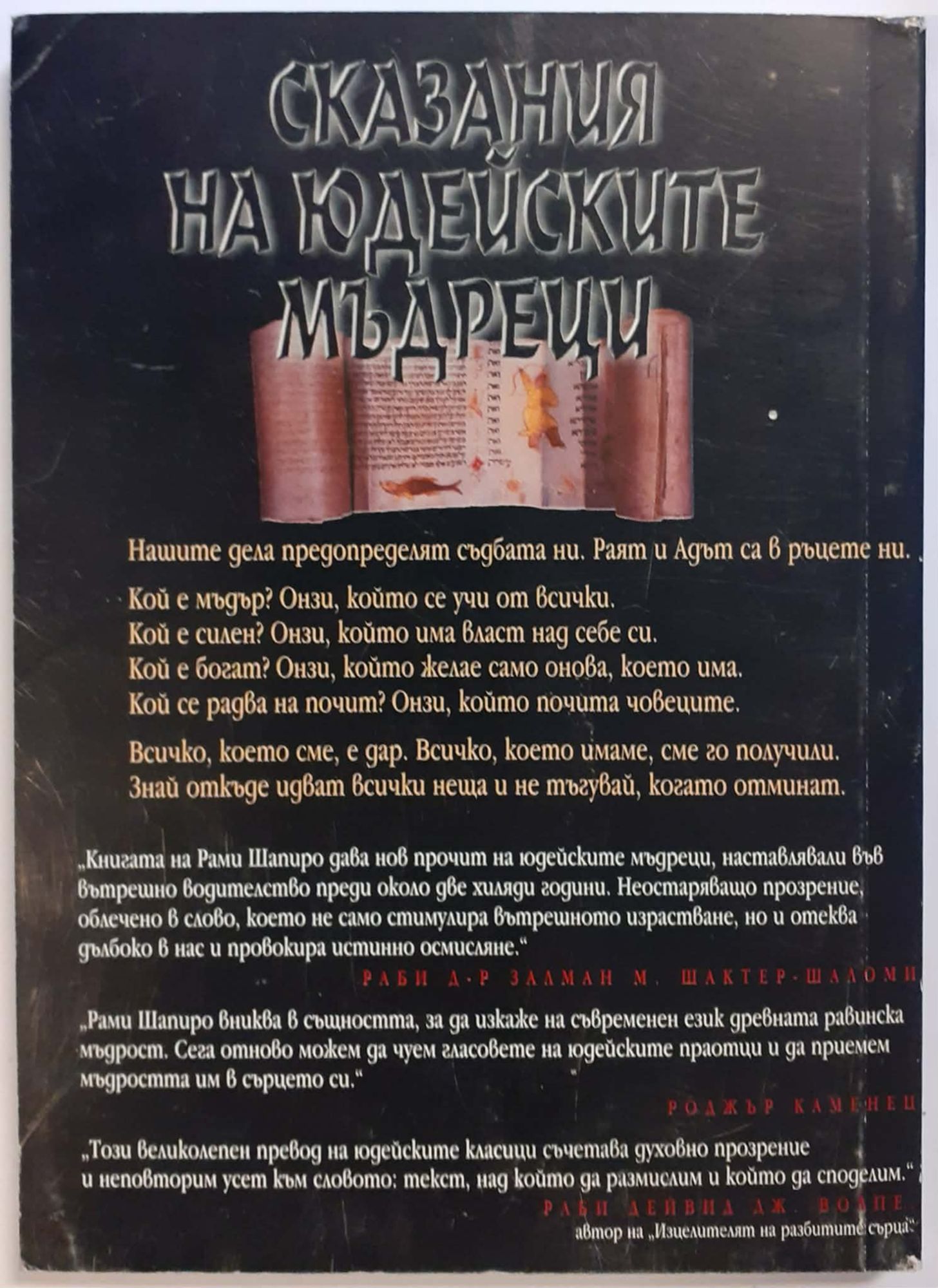 ПИРКЕ АВОТ, класическият сборник с юдейски афоризми. "Най-далновидните учители са онези, които заимстват от древната мъдрост и я насищат с нов смисъл. Това прави и Рави Рами Шапиро с новия прочит, с осъвременения и обогатен превод на "Пирке Авот", чиито притчи оживяват и заблестяват в неговите преработки." Артур Вашков