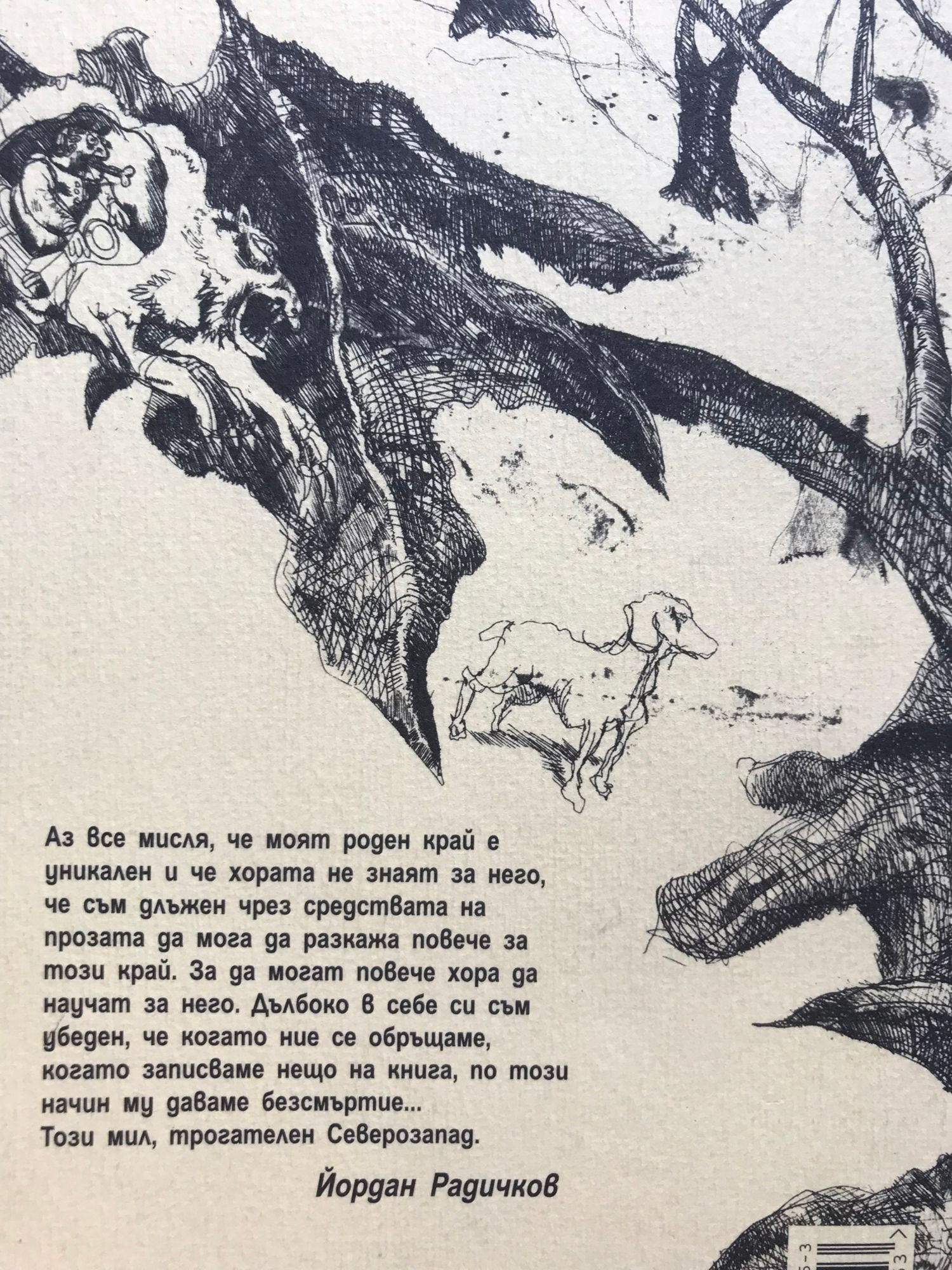 Аз все мисля, че моят роден край е уникален и че хората не знаят за него, че съм длъжен чрез средствата на прозата да мога да разкажа повече за този край. За да могат повече хора да научат за него. Дълбоко в себе си съм убеден, че когато ние се обръщаме, когато записваме нещо на книга, по този начин му даваме безсмъртие... Този мил, трогателен Северозапад. Йордан Радичков