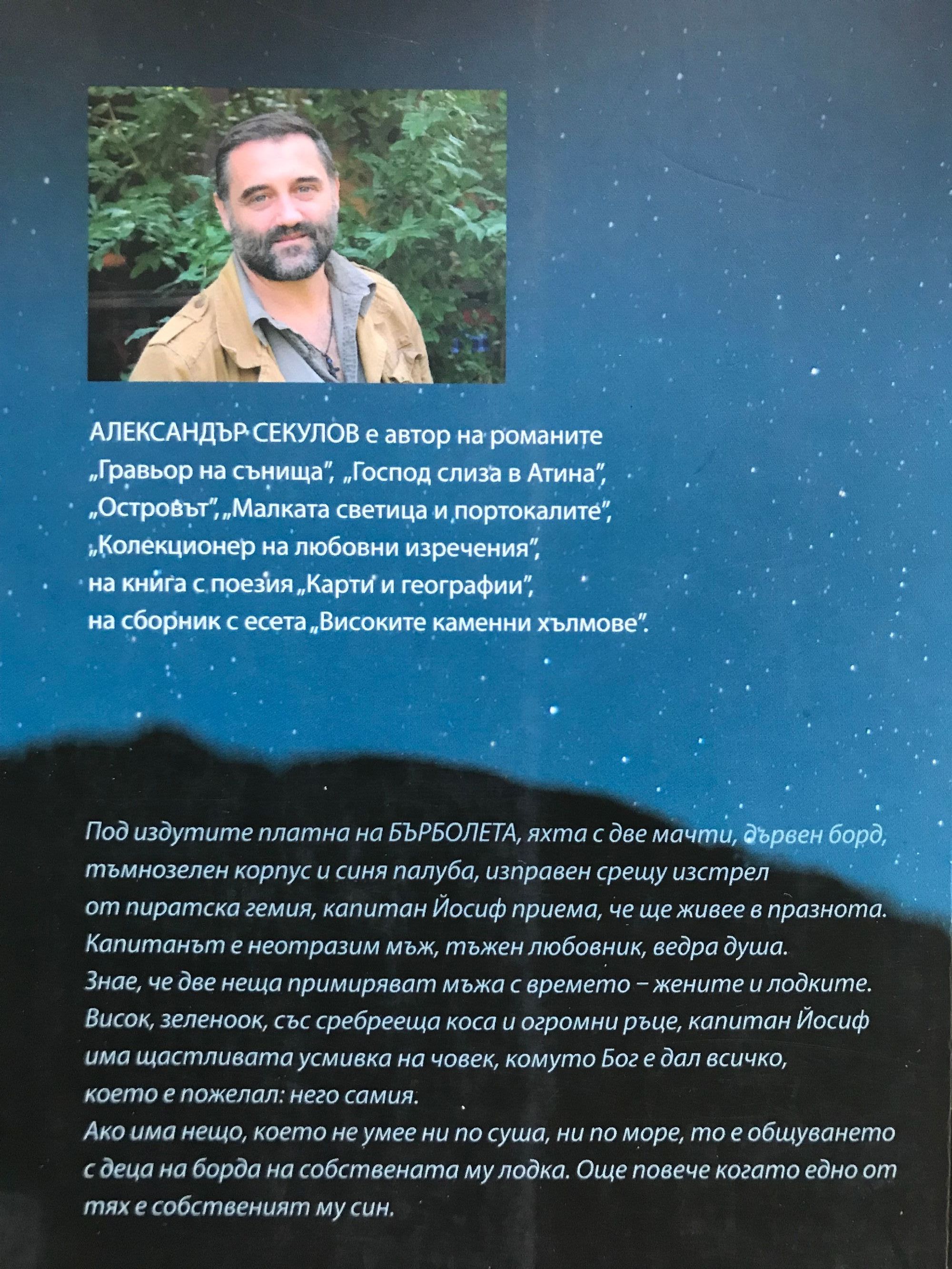 Под издутите платна на БЪРБОЛЕТА, яхта с две мачти, дървен борд, тъмнозелен корпус и синя палуба, изправен срещу изстрел от пиратска гемия, капитан Йосиф приема, че ще живее в празнота. Капитанът е неотразим мъж, тъжен любовник, ведра душа. Знае, че две неща примиряват мъжа с времето – жените и лодките. Висок, зеленоок, със сребрееща коса и огромни ръце, капитан Йосиф има щастливата усмивка на човек, комуто Бог е дал всичко, което e пожелал: него самия. Ако има нещо, което не умее ни по суша, ни по море, то е общуването с деца на борда на собствената му лодка. Още повече когато едно от тях е собственият му син. Александър Секулов е автор на романите „Гравьор на сънища”, „Господ слиза в Атина”, „Островът”, „Малката светица и портокалите”, „Колекционер на любовни изречения”, на книга с поезия „Карти и географии”, на сборник с есета „Високите каменни хълмове”.