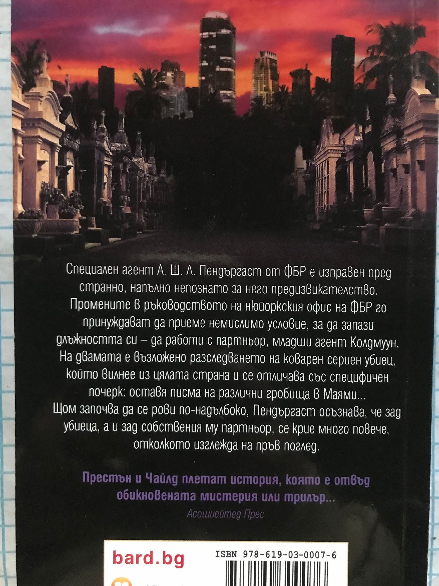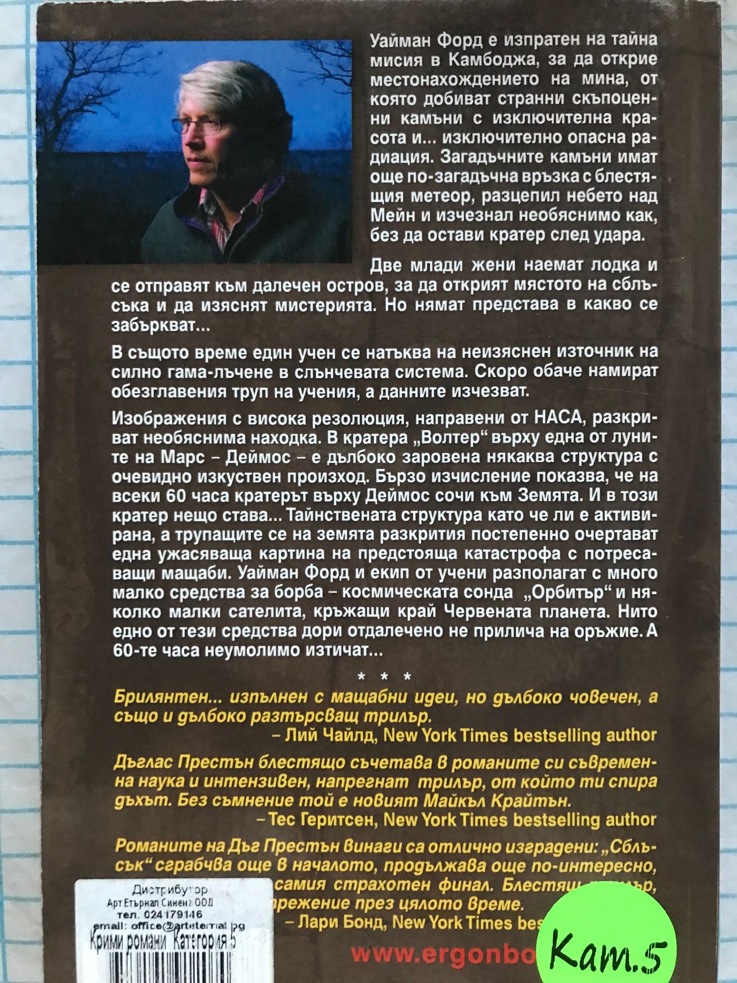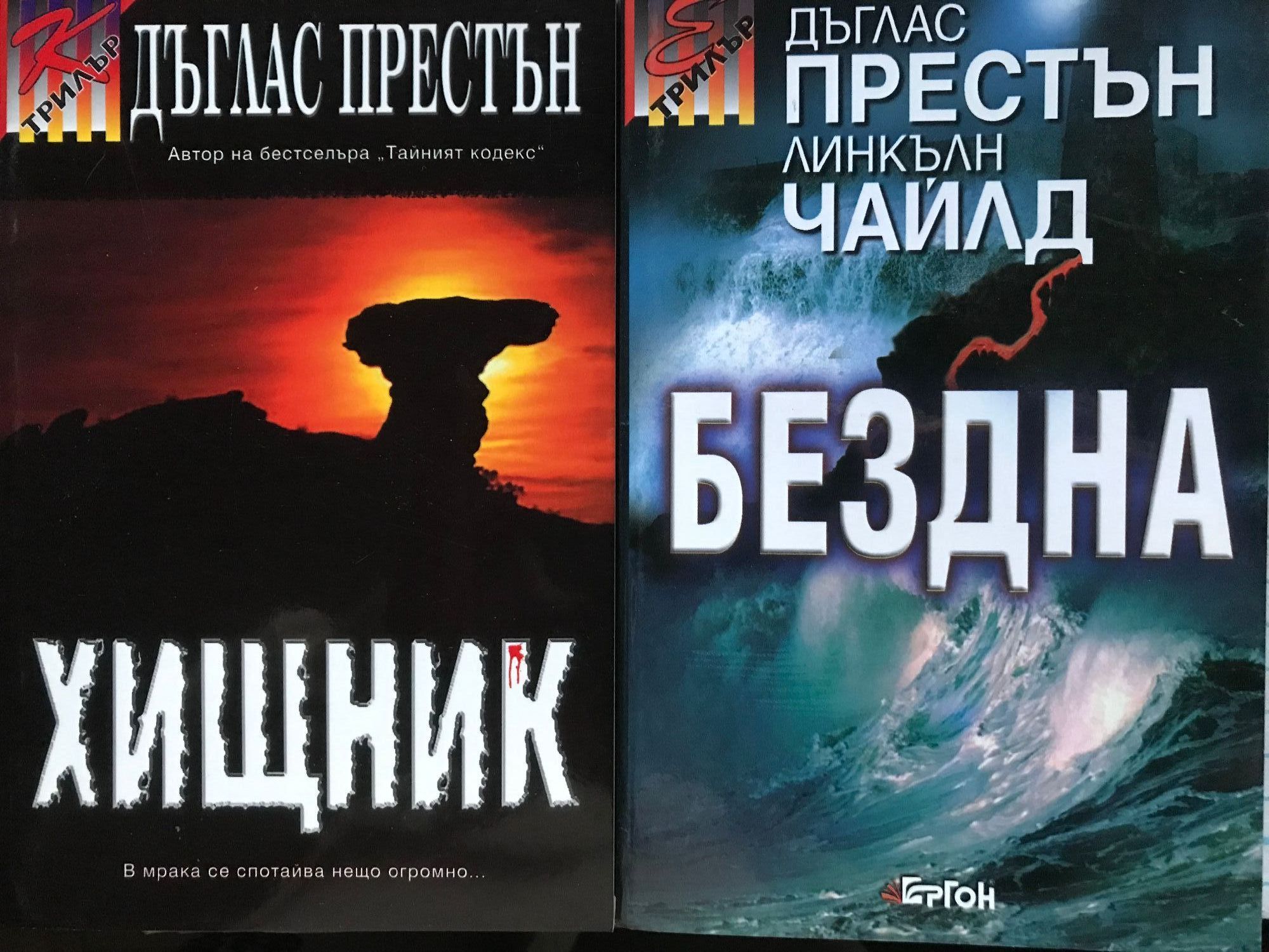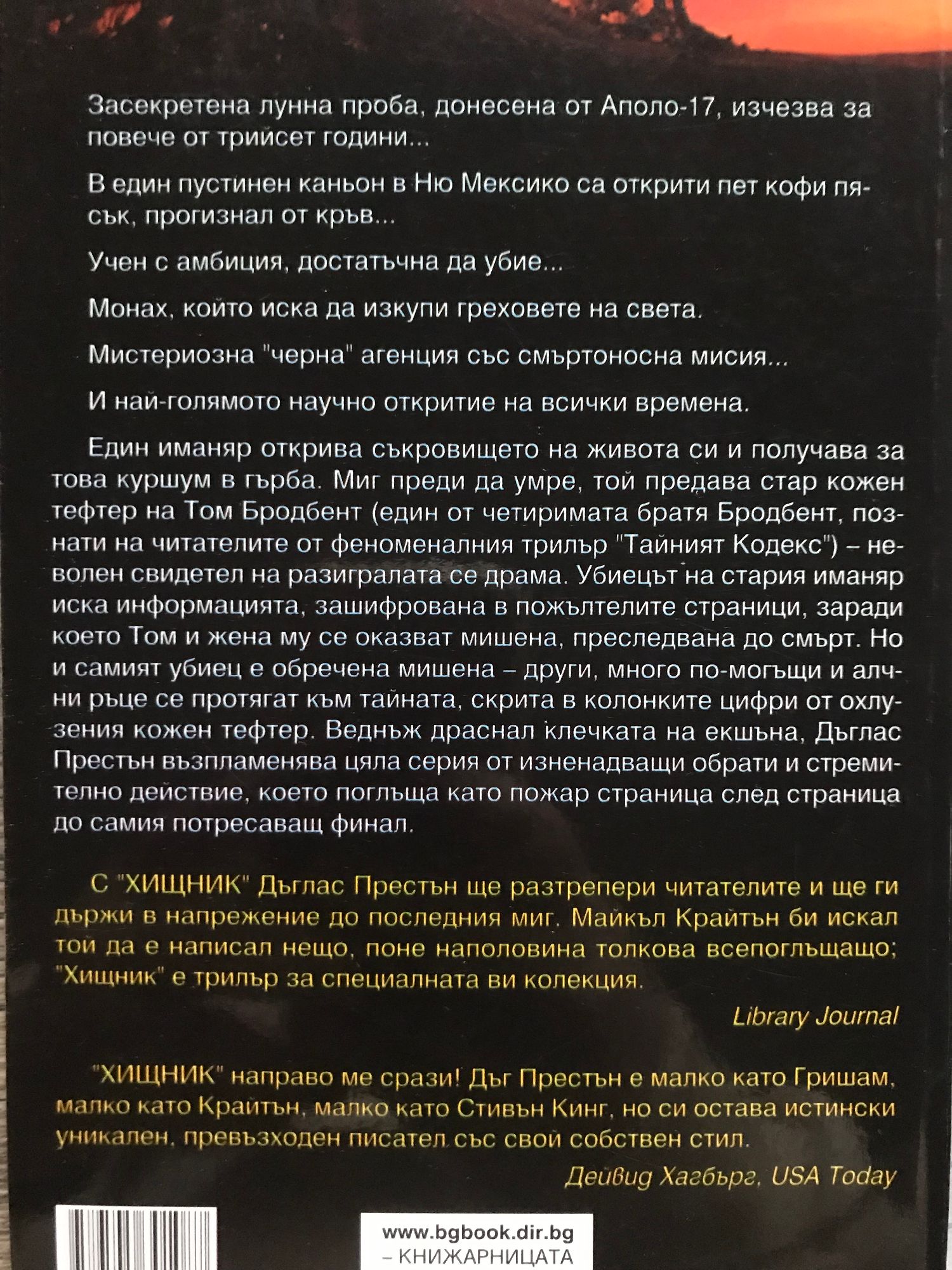 Книга 1: Специален агент Алойшъс Пендъргаст – един от най-интересните съвременни герои – се завръща в спиращия дъха нов роман на Дъглас Престън и Линкълн Чайлд. Отдавна забравена семейна тайна изскача от миналото, за да преследва специалния агент на ФБР Пендъргаст... Историята започва с убийство. Един от най-опасните и неумолими врагове на Пендъргаст е открит убит пред собствената му входна врата. Пендъргаст няма представа кой е отговорен за убийството и защо трупът е оставен пред неговия дом. Загадката носи всички белези на съвършеното престъпление, включително една тайнствена следа: парче тюркоаз, намерено в стомаха на починалия. Скъпоценният камък отвежда Пендъргаст в една изоставена мина на брега на калифорнийското езеро Солтън. Скоро той научава, че става дума за нещо повече от призрачен епизод във фамилната история: преследва го умел убиец, търсещ отмъщение за древна несправедливост. Агентът бързо се оказва в плен на зловещ и хитър план... Книга 2: Уаймън Форд е изпратен на тайна мисия в Камбоджа, за да открие местонахождението на мина, от която добиват странни скъпоценни камъни с изключителна красота и... изключително опасна радиация. Загадъчните камъни имат още по-загадъчна връзка с блестящия метерор, разцепил небето над Мейн и изчезнал необяснимо как, без да остави кратер след удара. Две млади жени наемат лодка и се отправят към далечен остров, за да открият мястото на сблъсъка и да изяснят мистерията. Но нямат представа в какво се забъркват... В същото време един учен се натъква на ниезяснен източник на силно гама-лъчение в слънчевата система. Скоро обаче намират обезглавения труп на учения, а данните изчезват... "Брилянтен... изпълнен с мащабни идеи, но дълбоко човечен, а също и дълбоко разтърсващ трилър." Лий Чайлд, New York Times bestselling author Книга 3: Засекретена лунна проба, донесена от Аполо-17, изчезва за повече от трийсет години... В един пустинен каньон в Ню Мексико са открити пет кофи пясък, прогизнал от кръв... Учен с амбиция, достатъчна да убие... Монах, които иска да изкупи греховете на света. Мистериозна "черна" агенция със смъртоносна мисия... И най-голямото научно откритие на всички времена. Един иманяр открива съкровището на живота си и получава за това куршум в гърба. Миг преди да умре, той предава стар кожен тефтер на Том Бродбент (един от четиримата братя Бродбент, познати на читателите от феноменалния трилър "Тайният Кодекс") - неволен свидетел на разигралата се драма. Убиецът на стария иманяр иска информацията, зашифрована в пожълтелите страници, заради което Том и жена му се оказват мишена, преследвана до смърт. Но и самият убиец е обречена мишена - други, много по-могъщи и алчни ръце се протягат към тайната, скрита в колонките цифри от охлузения кожен тефтер. Веднъж драснал клечката на екшъна, Дъглас Престьн възпламенява цяла серия от изненадващи обрати и стремително действие, което поглъща като пожар страница след страница до самия потресаващ финал. С "ХИЩНИК" Дъглас Престън ще разтрепери читателите и ще ги държи в напрежение до последния миг. Майкъл Крайтън би искал той да е написал нещо, поне наполовина толкова всепоглъщащо; "Хищник" е трилър за специалната ви колекция. Library Journal "ХИЩНИК" направо ме срази! Дъг Престън е малко като Гришам, малко като Крайтън, малко като Стивън Кинг, но си остава истински уникален, превъзходен пи