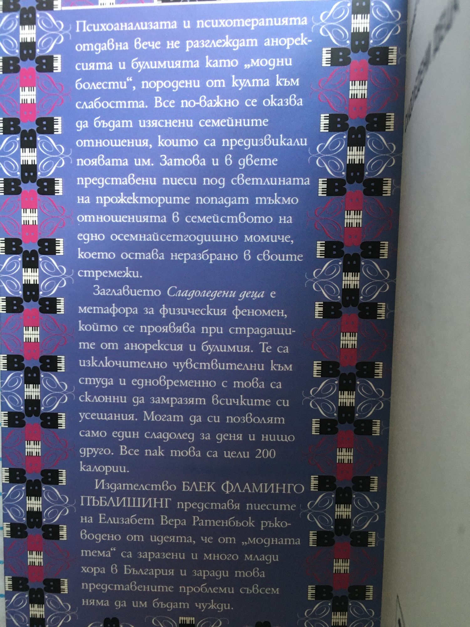 Психоанализата и психотерапията отдавна вече не разглеждат анорексията и булимията като "модни болести", породени от култа към слабостта. Все по-важно се оказва да бъдат изяснени семейните отношения, които са предизвикали появата им. Затова и в двете представени пиеси под светлината на прожекторите попадат тъкмо отношенията в семейството на едно осемнайсетгодишно момиче, което остава неразбрано в своите стремежи. Заглавието "Сладоледени деца" е метафора за физическия феномен, който се проявява при страдащите от анорексия и булимия. Те са изключително чувствителни към студа и едновременно с това са склонни да замразят всичките си усещания. Могат да си позволят само един сладолед за деня и нищо друго. Все пак това са цели 200 калории.