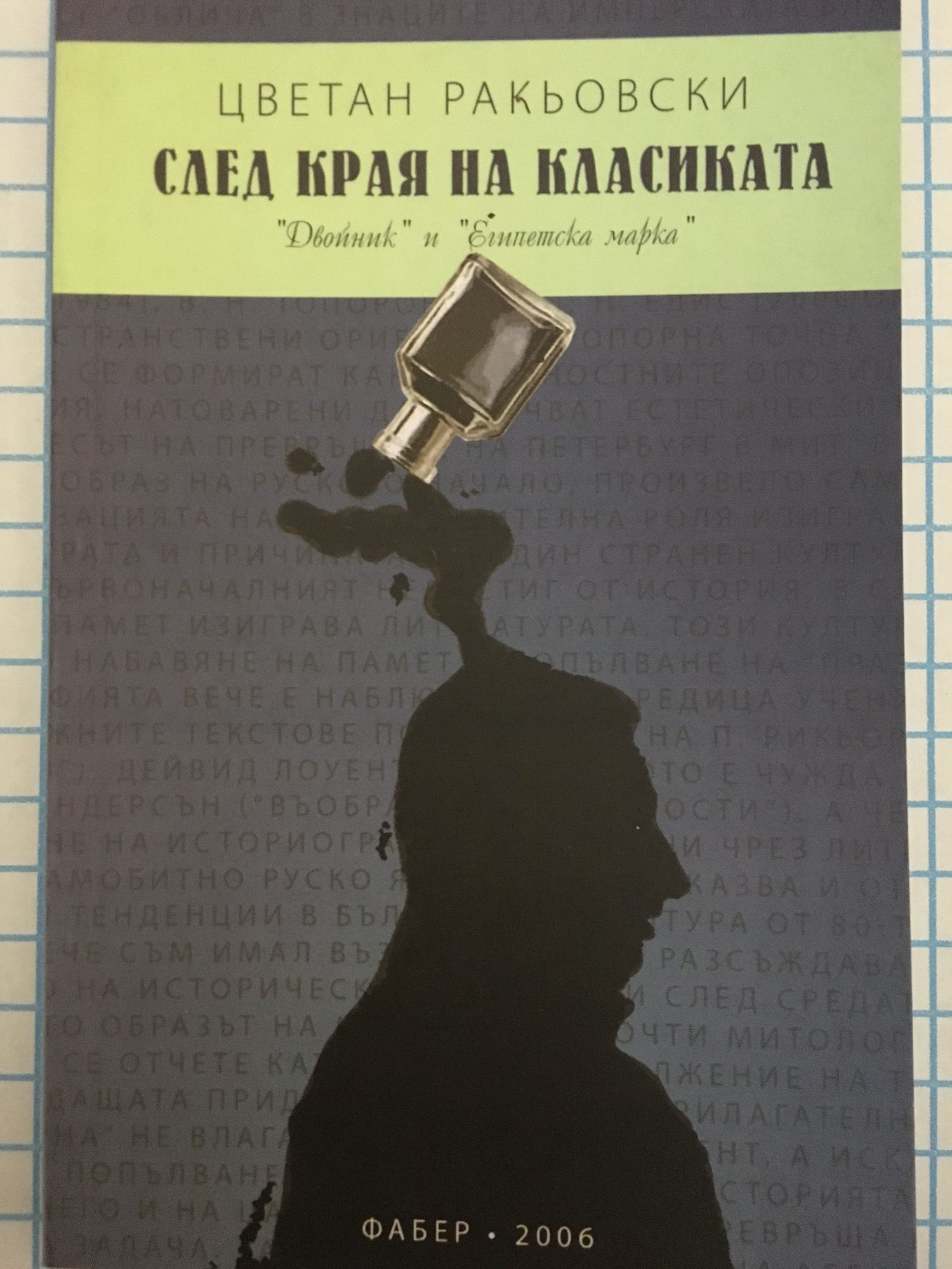 След края на класиката има за свой обект две гранични повести: "Двойник" на Фьодор Достоевски и "Египетска марка" на Осип Манделщам. Повестта "Египетска марка" е уникална с композицията, персонажите, с начина, по който интерпретира идеята си за социалния хаос във времето на радикални промени в Русия. В нея откриваме една отворена композиция, която позволява текстът да набавя своите значения от широко поле контексти. Един от тях е "Двойник" на Ф. Достоевски. Двете творби са свързани от общата тема за града. Но Петербург не е единствената междутекстова връзка. Лабиринтът, социалният хаос, малкият човек са другите общи топоси между тях. И ако Достоевски превръща града в повод да изобрази своя нищожен герой, то Манделщам центрира цялата повествователна енергия само към пространството. То ще бъде метагероят на новата проза.