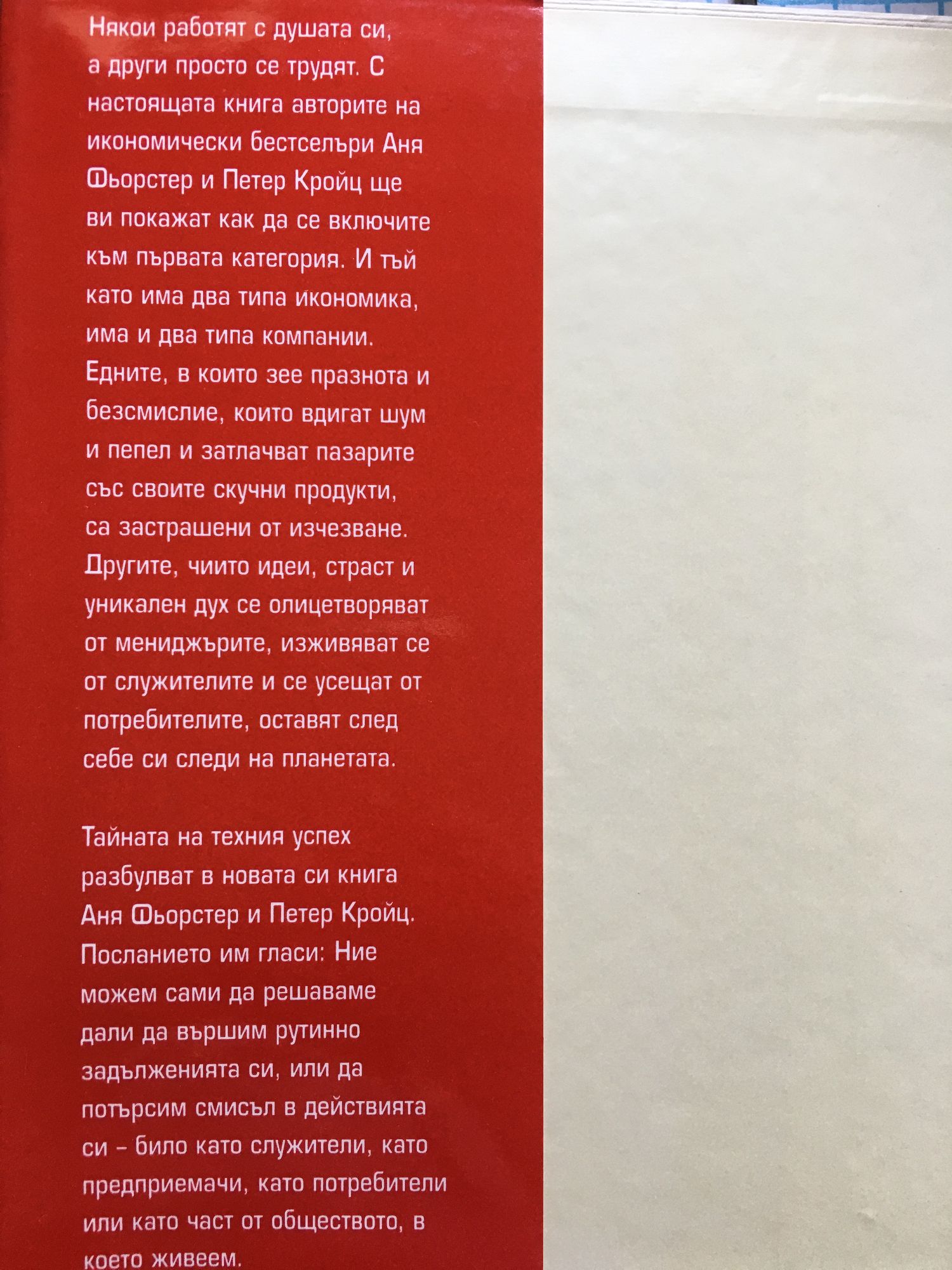 Внимание, тази книга е страстен апел към преосмисляне! Вие решавате дали да разпръсквате пепел, или да оставяте дири след себе си. Бъдещето принадлежи на онези компании, за които „смисълът" има значение, и чиито служители, а дори и клиенти получават усещането за участие в значими дела. Който иска да оставя следи, трябва да върви пред останалите. Авторите на икономически бестселъри Аня Шьорстер и Петер Кройц показват как да стане това. Някои работят с душата си, а други просто се трудят. С настоящата книга авторите на икономически бестселъри Аня Фьорстер и Петер Кройц ще ви покажат как да се включите към първата категория. И тъй като има два типа икономика има и два типа компании. Едните, в които зее празнота и безмислие, които вдигат шум и пепел и затлачват пазарите със своите скучни продукти, са застрашени от изчезване. Другите, чиито идеи, страст и уникален дух се олицетворяват от мениджърите, изживяват се от служителите и се усещат от потребителите, оставят след себе си следи на планетата. Тайната на техния успех разбулват в новата си книга Аня Фьорстер и Петер Кройц. Посланието им гласи: Ние можем сами да решаваме дали да вършим рутинно задълженията си, или да потърсим смисъл в действията си – било като служители, като предприемачи, като потребители или като част от обществото, в което живеем. "Следи вместо пепел" е тематично продължение на "Всякакви, но нестандартни", която получи наградата за най-добра икономическа книга на 2007 година.