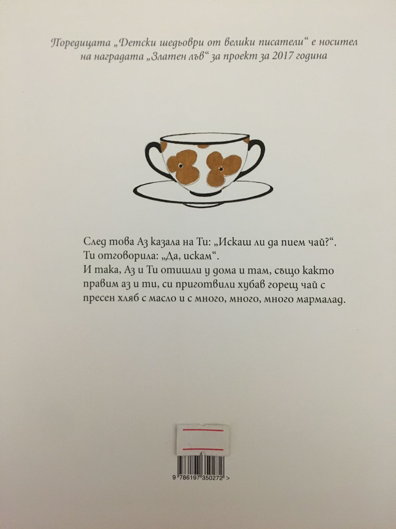 След това Аз казала на Ти: „Искаш ли да пием чай?” Ти отговорила: „Да, искам.” И така Аз и Ти отишли у дома и там, също както правим аз и ти, си приготвили хубав горещ чай с пресен хляб с масло и с много, много, много мармалад. За автора: Едуард Естлин Къмингс (1894-1962) е американски поет, художник, есеист, писател и драматург. Пише близо 2900 стихотворения, два автобиографични романа, четири пиеси и няколко есета. Три от приказките в тази книга той създава за дъщеря си Нанси. Къмингс се разделя с майката и до 26-ата си годишнина момичето не знае кой е баща му. Запознават се, когато се ражда внукът на поета. Тогава се появява и „Слонът и пеперудът”.
