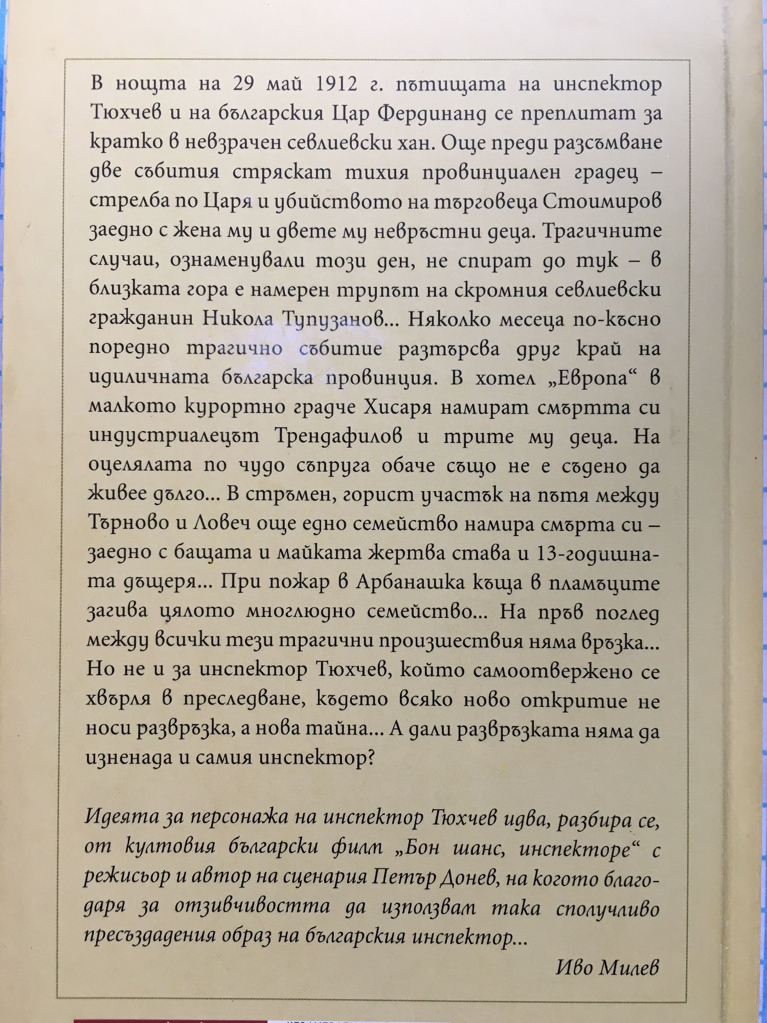 В нощта на 29-и май, 1912 г., пътищата на инспектор Тюхчев и българския Цар Фердинанд се преплитат за кратко в невзрачен севлиевски хан. Още преди разсъмване две събития стряскат тихия провинциален градец – стрелба по Царя и убийството на търговеца Стоимиров, заедно с жена му и двете му невръсни деца. Трагичните случаи, ознаменували този ден, не спират до тук – в близката гора е намерен трупа на скромния севлиевски гражданин Никола Тупузанов… Няколко месеца по-късно поредно трагично събитие разтърсва друг край на идиличната българска провинция. В хотел “Европа” в малкото курортно градче Хисаря намират смъртта си индустриалеца Трендафилов и трите му деца. На по чудо оцелялата съпруга обаче също не е съдено да живее дълго… В стръмен, горист участък на пътя между Търново и Ловеч – още едно семейство намира смъртта си, заедно с бащата и майката, жертва става и 13-годишната дъщеря… При пожар в къща в Арбанаси в пламъците загива цялото многлюдно семейство… На пръв поглед между всички тези трагични произшествия няма връзка… Но не и за инспектор Тюхчев, който самоотвержено се хвърля в преследване, където всяко ново откритие не носи развръзка, а нова тайна… А дали развръзката няма да изненада и самият инспектор?