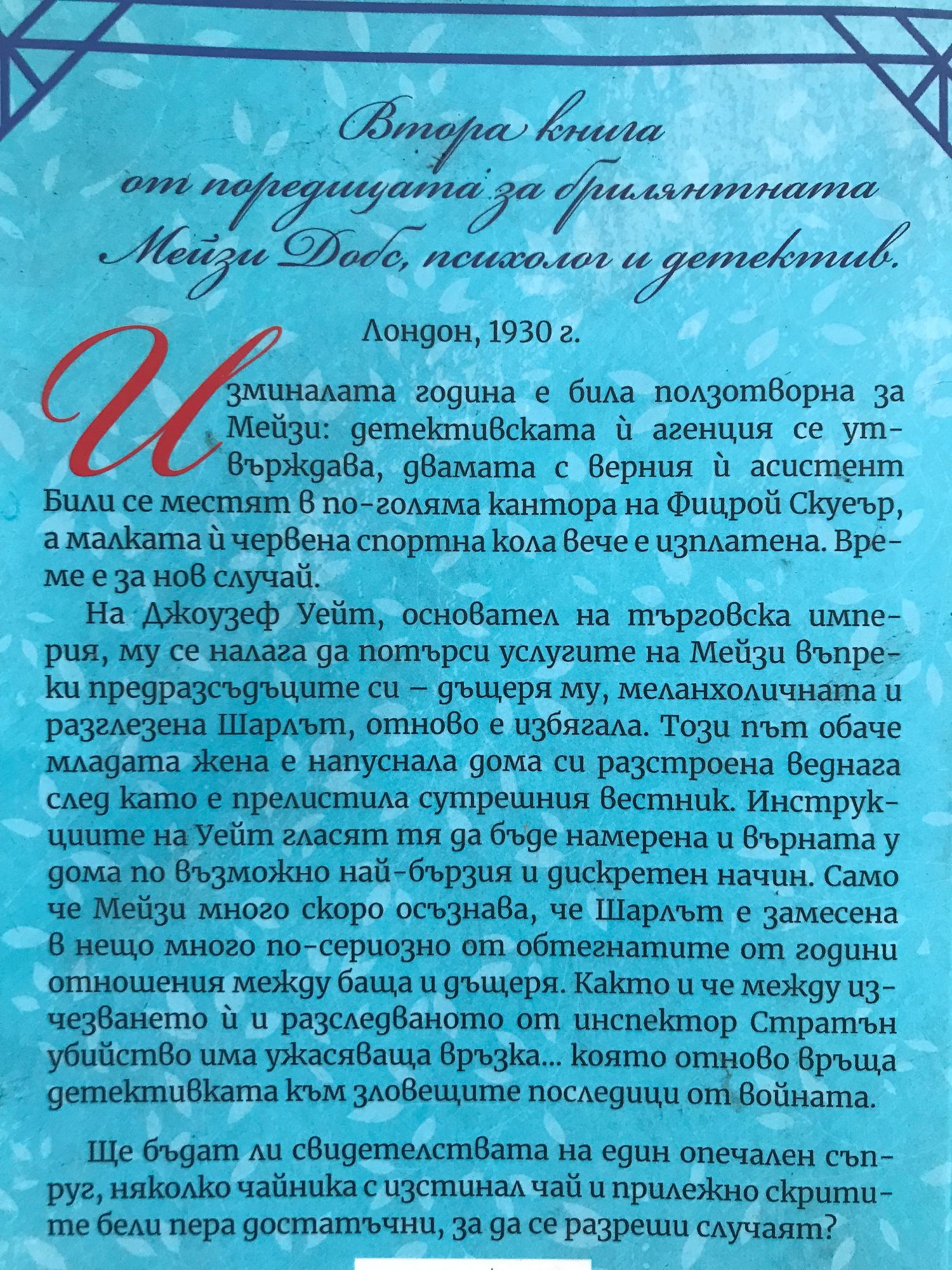 Втора книга от поредицата за брилянтната Мейзи Добс, психолог и детектив Лондон, 1930 г. Изминалата година е била ползотворна за Мейзи: детективската й агенция се утвърждава, двамата с верния й асистент Били се местят в по-голяма кантора на Фицрой Скуеър, а малката й червена спортна кола вече е изплатена. Време е за нов случай. На Джоузеф Уейт, основател на търговска империя, му се налага да потърси услугите на Мейзи въпреки предразсъдъците си – дъщеря му, меланхоличната и разглезена Шарлът, отново е избягала. Този път обаче младата жена е напуснала дома си разстроена веднага след като е прелистила сутрешния вестник. Инструкциите на Уейт гласят тя да бъде намерена и върната у дома по възможно най-бързия и дискретен начин. Само че Мейзи много скоро осъзнава, че Шарлът е замесена в нещо много по-сериозно от обтегнатите от години отношения между баща и дъщеря. Както и че между изчезването й и разследваното от инспектор Стратън убийство има ужасяваща връзка… която отново връща детективката към зловещите последици от войната. Ще бъдат ли свидетелствата на един опечален съпруг, няколко чайника с изстинал чай и прилежно скритите бели пера достатъчни, за да се разреши случаят?