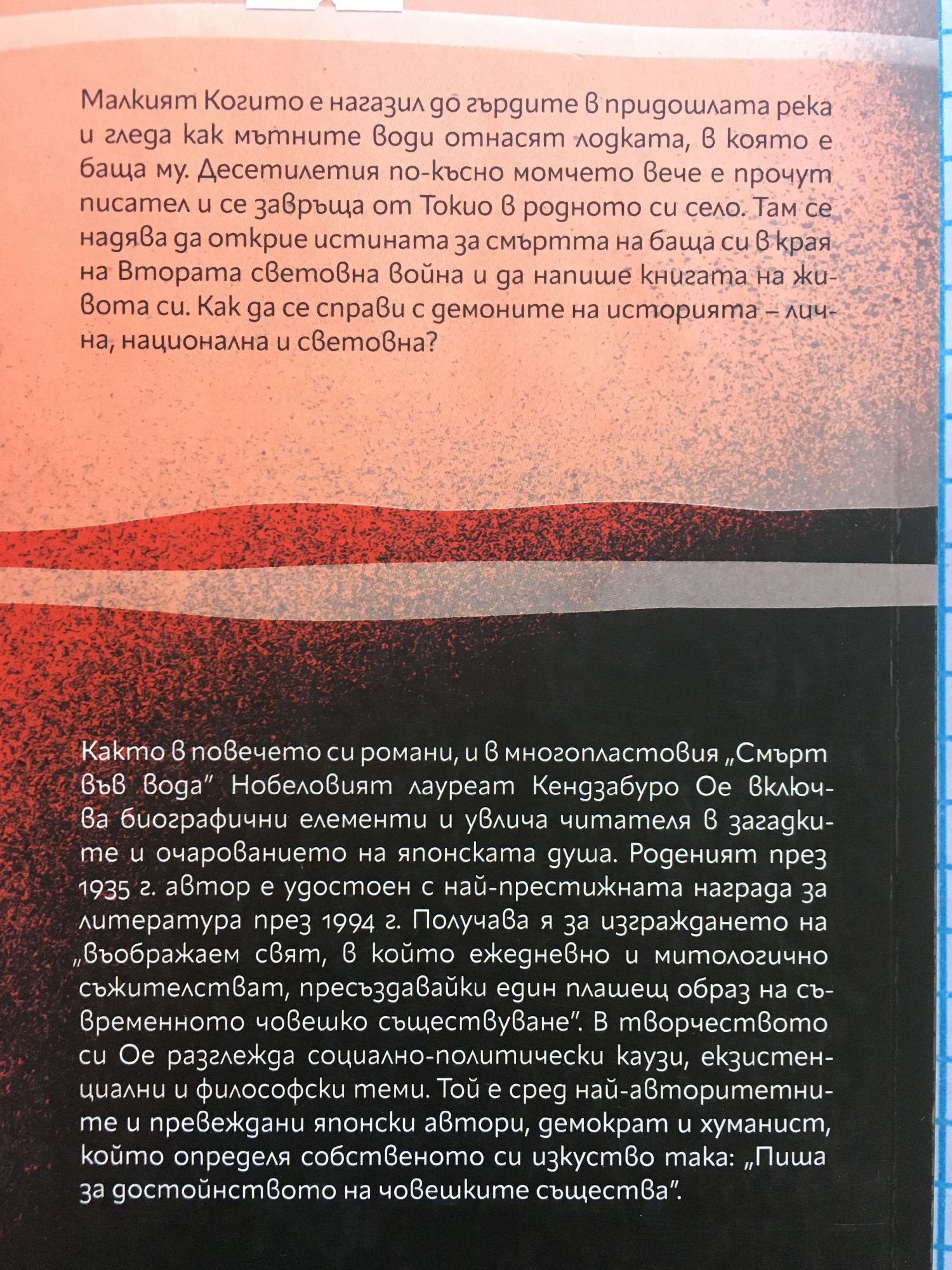 Малкият Когито е нагазил до гърдите в придошлата река и гледа как мътните води отнасят лодката, в която е баща му. Десетилетия по-късно момчето вече е прочут писател и се завръща от Токио в родното си село. Там се надява да открие истината за смъртта на баща си в края на Втората световна война и да напише книгата на живота си. Как да се справи с демоните на историята – лична, национална и световна? Както в повечето си романи, и в многопластовия „Смърт във вода” Нобеловият лауреат Кендзабуро Ое включва биографични елементи и увлича читателя в загадките и очарованието на японската душа. Роденият през 1935 г. автор е удостоен с най-престижната награда за литература през 1994 г. Получава я за изграждането на „въображаем свят, в който ежедневно и митологично съжителстват, пресъздавайки един плашещ образ на съвременното човешко съществуване”. В творчеството си Ое разглежда социално-политически каузи, екзистенциални и философски теми. Той е сред най-авторитетните и превеждани японски автори, демократ и хуманист, който определя собственото си изкуство така: „Пиша за достойнството на човешките същества”.