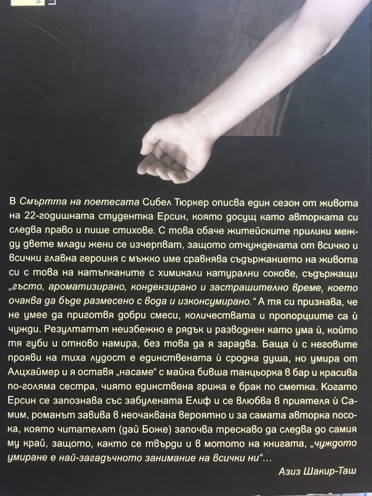 В "Смъртта на поетесата" Сибел Тюркер описва един сезон от живота на 22-годишната студентка Ерсин, която досущ като авторката си следва право и пише стихове. С това обаче житейските прилики между двете млади жени се изчерпват, защото отчуждената от всичко и всички главна героиня с мъжко име сравнява съдържанието на живота си с това на натъпканите с химикали натурални сокове, съдържащи „гъсто, ароматизирано, кондензирано и застрашително време, което очаква да бъде размесено с вода и изконсумирано." А тя си признава, че не умее да приготвя добри смеси, количествата и пропорциите са й чужди. Резултатът неизбежно е рядък и разводнен като ума й, който тя губи и отново намира, без това да я зарадва. Баща й с неговите прояви на тиха лудост е единствената й сродна душа, но умира от Алцхаймер и я оставя „насаме" с майка бивша танцьорка в бар и красива по-голяма сестра, чиято единствена грижа е брак по сметка. Когато Ерсин се запознава със забулената Елиф и се влюбва в приятеля й Самим, романът завива в неочаквана вероятно и за самата авторка посока, която читателят (дай Боже) започва трескаво да следва до самия му край, защото, както се твърди и в мотото на книгата, „чуждото умиране е най-загадъчното занимание на всички ни"...