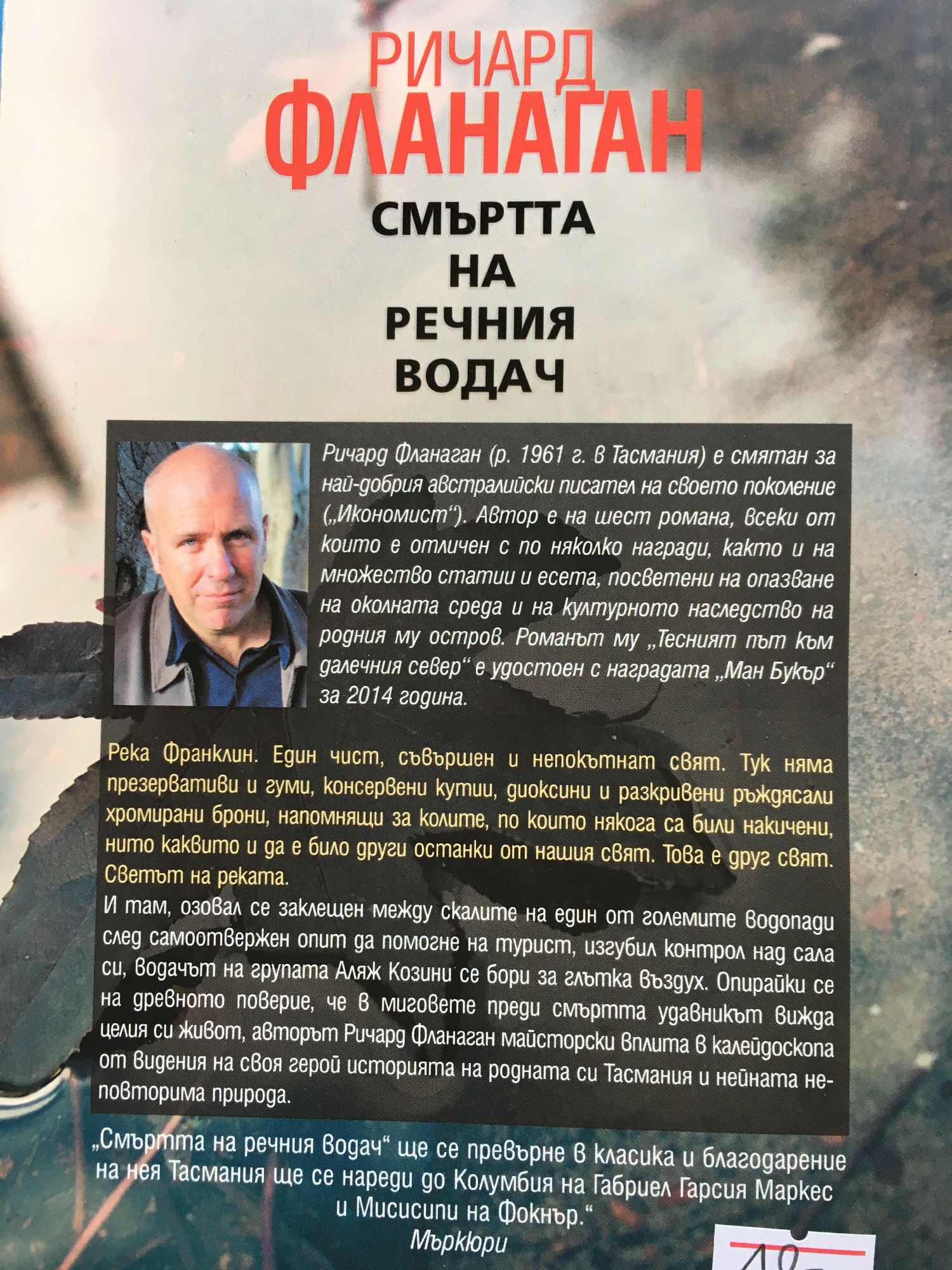 „Река Франклин. Един чист, съвършен и непокътнат свят. Тук няма презервативи и гуми, консервени кутии, диоксини и разкривени ръждясали хромирани брони, напомнящи за колите, по които някога са били накичени, нито каквито и да е било други останки от нашия свят. Това е друг свят. Светът на реката.“ И там, озовал се заклещен между скалите на един от големите водопади след самоотвержен опит да помогне на турист, изгубил контрол над сала си, водачът на групата Аляж Козини се бори за глътка въздух. Опирайки се на древното поверие, че в миговете преди смъртта удавникът вижда целия си живот, авторът Ричард Фланаган, майсторски вплита в калейдоскопа от видения на своя герой историята на родната си Тасмания и нейната неповторима природа. „Смъртта на речния водач” ще се превърне в класика и благодарение на нея Тасмания ще се нареди до Колумбия на Габриел Гарсия Маркес и Мисисипи на Фокнър.” „Мъркюри” „Ще ви грабне като водовъртеж – скачайте смело!” „Индипендънт”