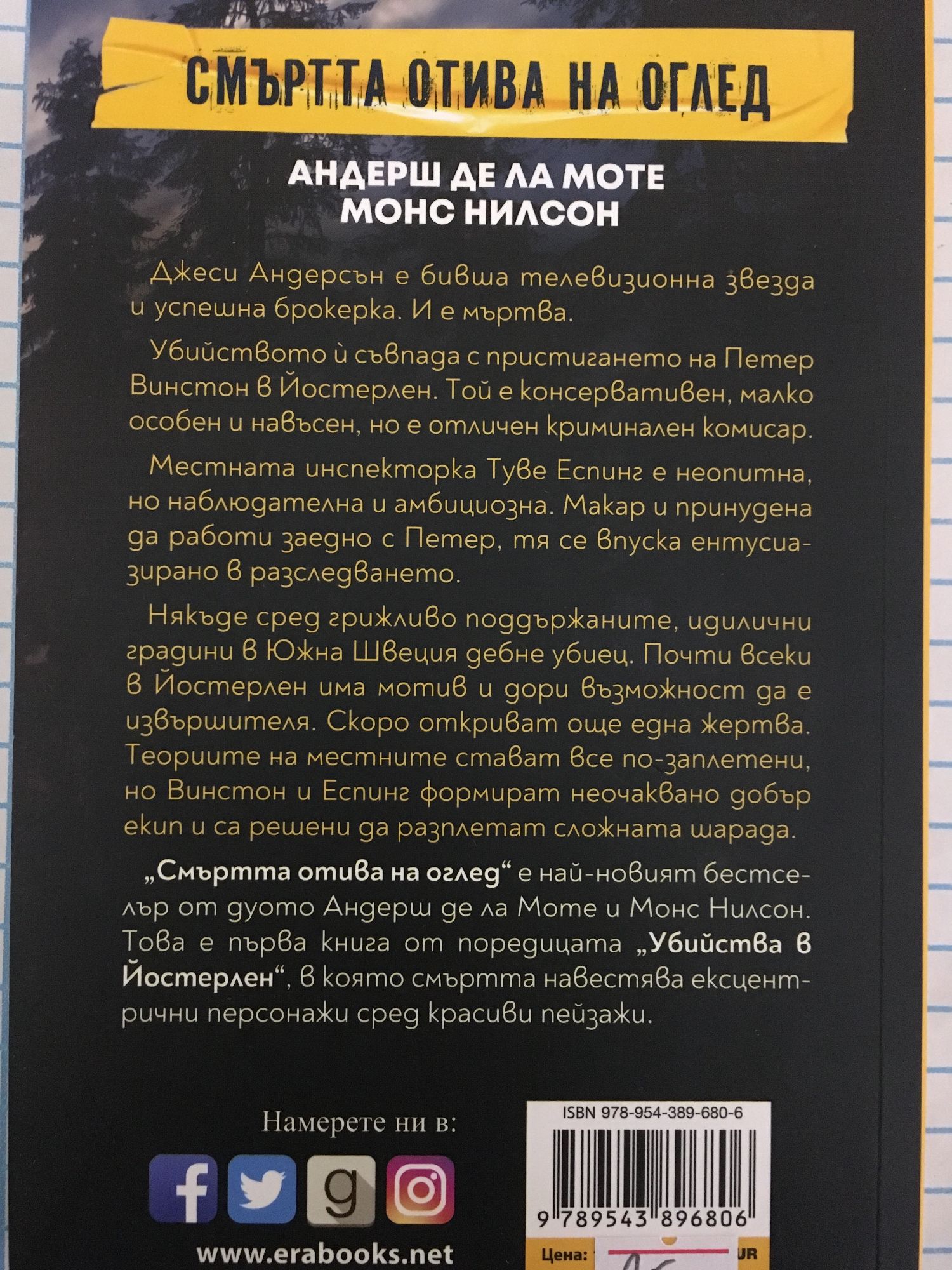 Джеси Андерсън е бивша телевизионна звезда и успешна брокерка. И е мъртва. Убийството й съвпада с пристигането на Петер Винстон в Йостерлен. Той е консервативен, малко особен и навъсен, но е отличен криминален комисар. Местната инспекторка Туве Еспинг е неопитна, но наблюдателна и амбициозна. Макар и принудена да работи заедно с Петер, тя се впуска ентусиазирано в разследването. Някъде сред грижливо поддържаните, идилични градини в Южна Швеция дебне убиец. Почти всеки в Йостерлен има мотив и дори възможност да е извършителя. Скоро откриват още една жертва. Теориите на местните стават все по-заплетени, но Винстон и Еспинг формират неочаквано добър екип и са решени да разплетат сложната шарада. „Смъртта отива на оглед“ е най-новият бестселър от дуото Андерш де ла Моте и Монс Нилсон. Това е първа книга от поредицата „Убийства в Йостерлен“, в която смъртта навестява ексцентрични персонажи сред красиви пейзажи.