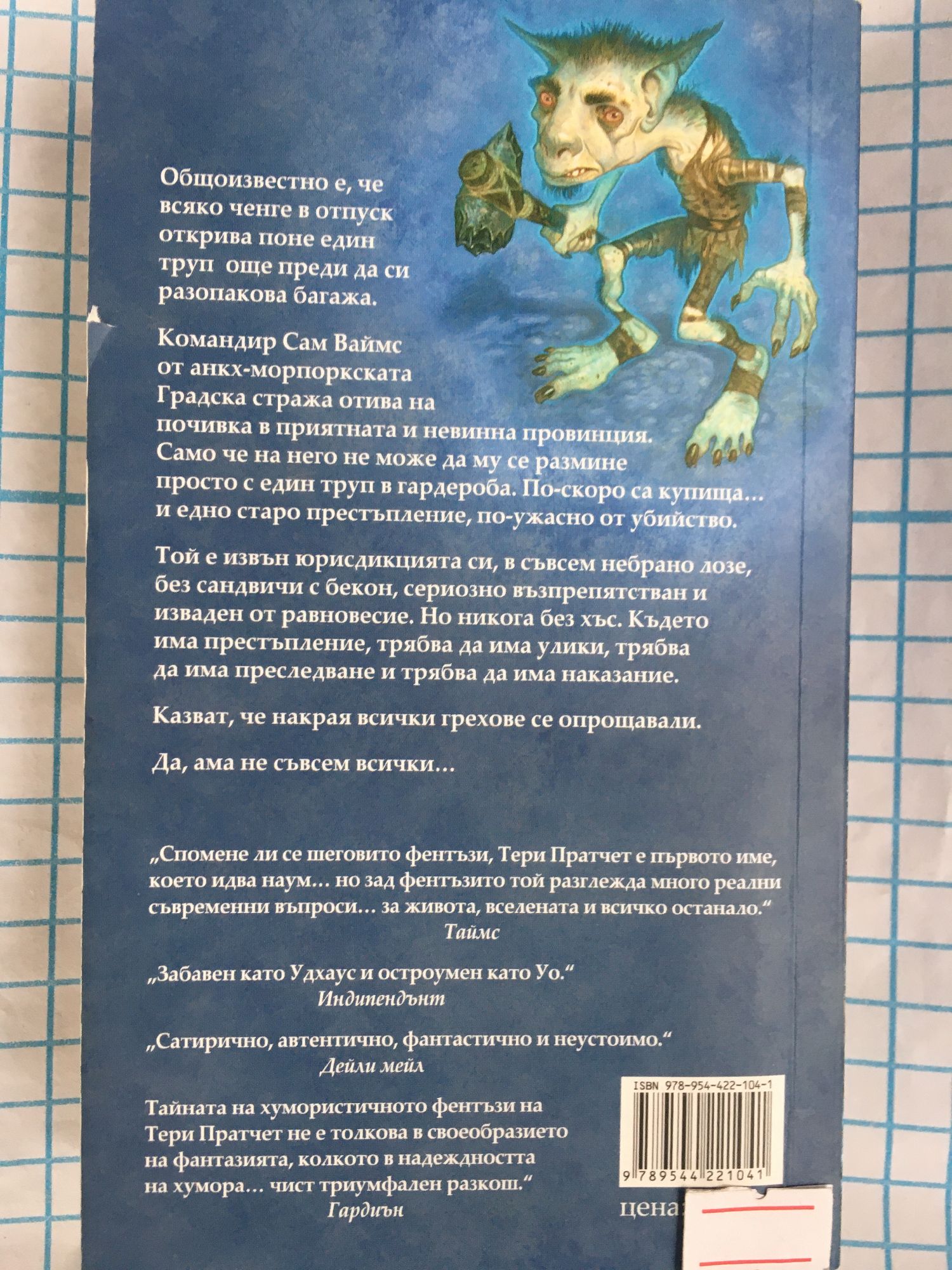 Общоизвестно е, че всяко ченге в отпуск открива поне единтруп още преди да си разопакова багажа. Командир Сам Ваймс от анкх-морпоркската Градска стража отива на почивка в приятната и невинна провинция. Само че на него не може да му се размине просто с един труп в гардероба. По-скоро са купища... и едно старо престъпление, по ужасно от убийство. Той е извън юрисдикцията си, в съвсем небрано лозе, без сандвичи с бекон, сериозно възпрепятстван и изваден от равновесие. Но никога без хъс. Където има престъпление, трябва да има улики, трябва да има преследване и трябва да има наказание. Казват, че накрая всички грехове се опрощавали. Да, ама не съвсем всички... "Спомене ли шеговито фентъзи, Тери Пратчет е първото име, което идва наум... но зад фентъзито той разглежда много реални съвременни въпроси... за живота, вселената и всичко останало." Таймс "Забавен като Удхаус и остроумен като Уо." Индипендънт "Сатирично, автентично, фантастично и неустоимо" Дейли мейл "Тайната на хумористичното фентъзи на Тери Пратчет не е толкова в своеобразието на фантазията, колкото в надеждността на хумора... чист триумфален разкош." Гардиън