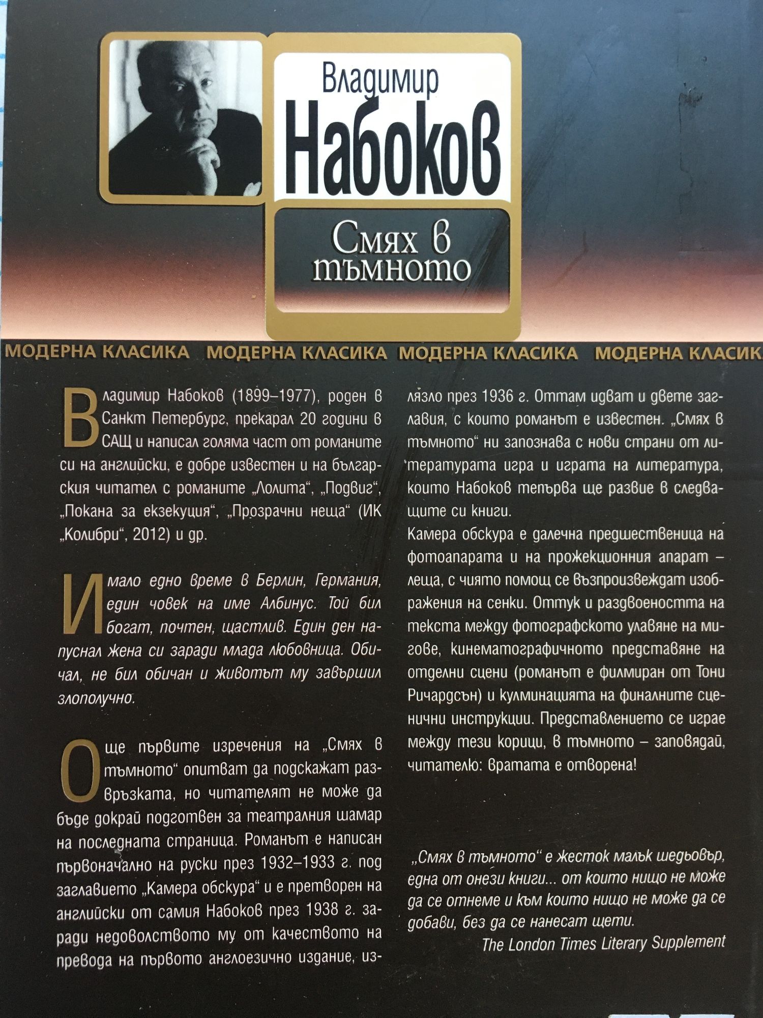 Имало едно време в Берлин, Германия, един човек на име Албинус. Той бил богат, почтен, щастлив. Един ден напуснал жена си заради млада любовница. Обичал, не бил обичан и животът му завършил злополучно. Още първите изречения на „Смях в тъмното“ опитват да подскажат развръзката, но читателят не може да бъде докрай подготвен за театралния шамар на последната страница. Романът е написан първоначално на руски през 1932–1933 г. под заглавието „Камера обскура“ и е претворен на английски от самия Набоков през 1938 г. заради недоволството му от качеството на превода на първото англоезично издание, излязло през 1936 година. Оттам идват и двете заглавия, с които романът е известен. „Смях в тъмното“ ни запознава с нови страни от литературата игра и играта на литература, които Набоков тепърва ще развие в следващите си книги. Камера обскура е далечна предшественица на фотоапарата и на прожекционния апарат – леща, с чиято помощ се възпроизвеждат изображения на сенки. Оттук и раздвоеността на текста между фотографското улавяне на мигове, кинематографичното представяне на отделни сцени (романът е филмиран от Тони Ричардсън) и кулминацията на финалните сценични инструкции. Представлението се играе между тези корици, в тъмното – заповядай, читателю: вратата е отворена! „Смях в тъмното“ е жесток малък шедьовър, една от онези книги... от които нищо не може да се отнеме и към които нищо не може да се добави, без да се нанесат щети. The London Times Literary Supplement