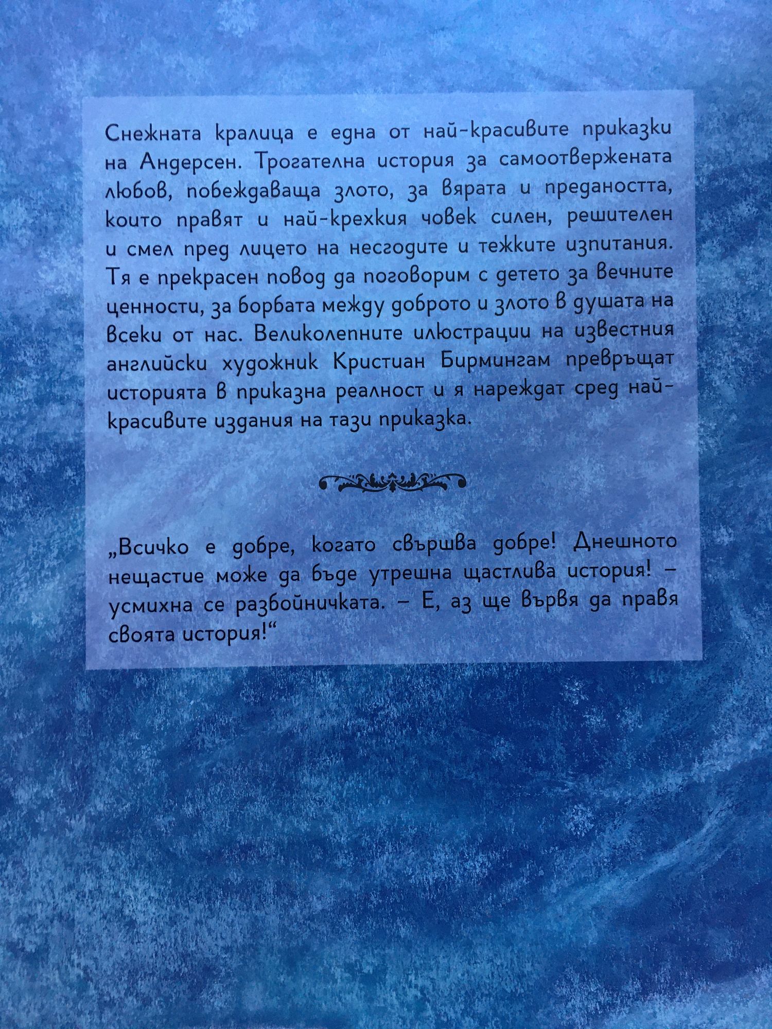 Подарете си една класическа зимна приказка от невероятния Ханс Кристиан Андерсен Тази илюстрована книжка е прекрасен повод да поговорим с детето за вечните ценности, за борбата между доброто и злото в душата на всеки от нас! Великолепните илюстрации на известния английски художник Кристиан Бирмингам превръщат историята в приказна реалност и я нареждат сред най-красивите издания на тази приказка.
