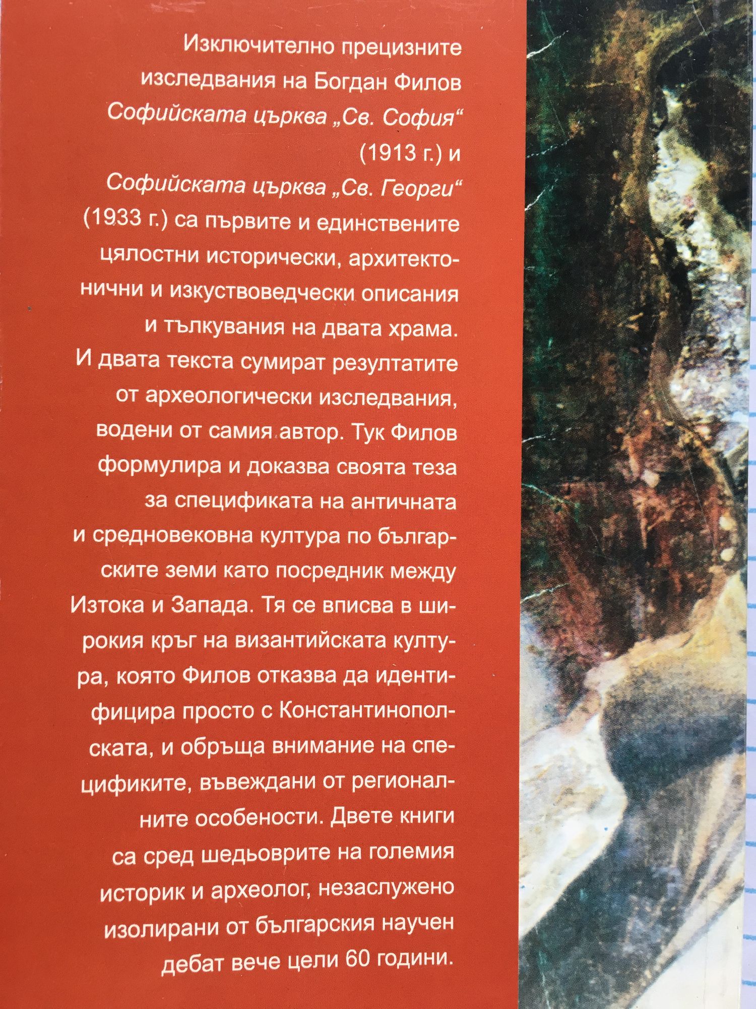 Изключително прецизните изследвания на Богдан Филов Софийската църква „Се. София" (1913 г.) и Софийската църква „Св. Георги" (1933 г.) са първите и единствените цялостни исторически, архитектонични и изкуствоведчески описания и тълкувания на двата храма. И двата текста сумират резултатите от археологически изследвания, водени от самия автор. Тук Филов формулира и доказва своята теза за спецификата на античната и средновековна култура по българските земи като посредник между Изтока и Запада. Тя се вписва в широкия кръг на византийската култура, която Филов отказва да идентифицира просто с Константинополската, и обръща внимание на спецификите, въвеждани от регионалните особености. Двете книги са сред шедьоврите на големия историк и археолог, незаслужено изолирани от българския научен дебат вече цели 60 години.