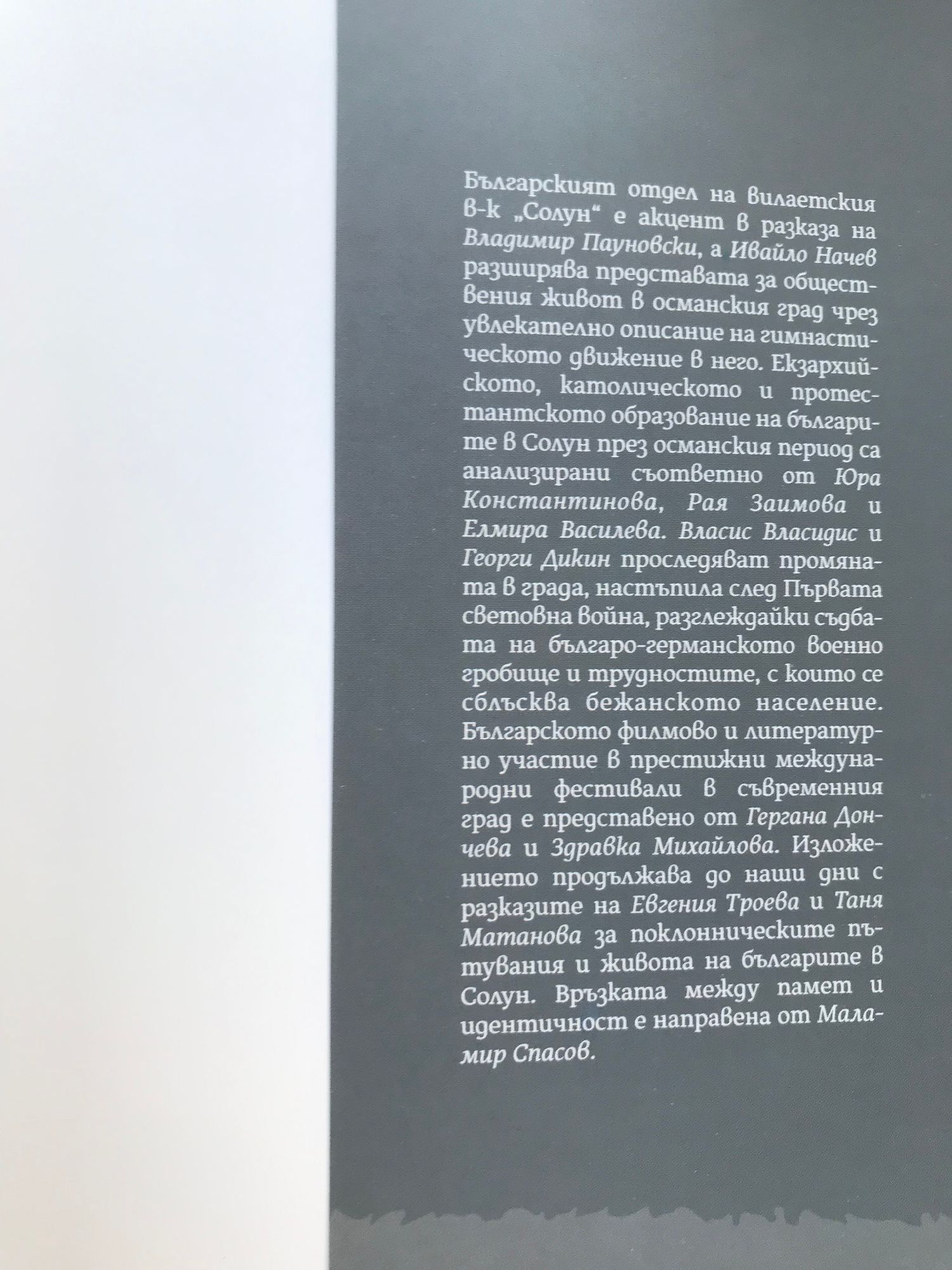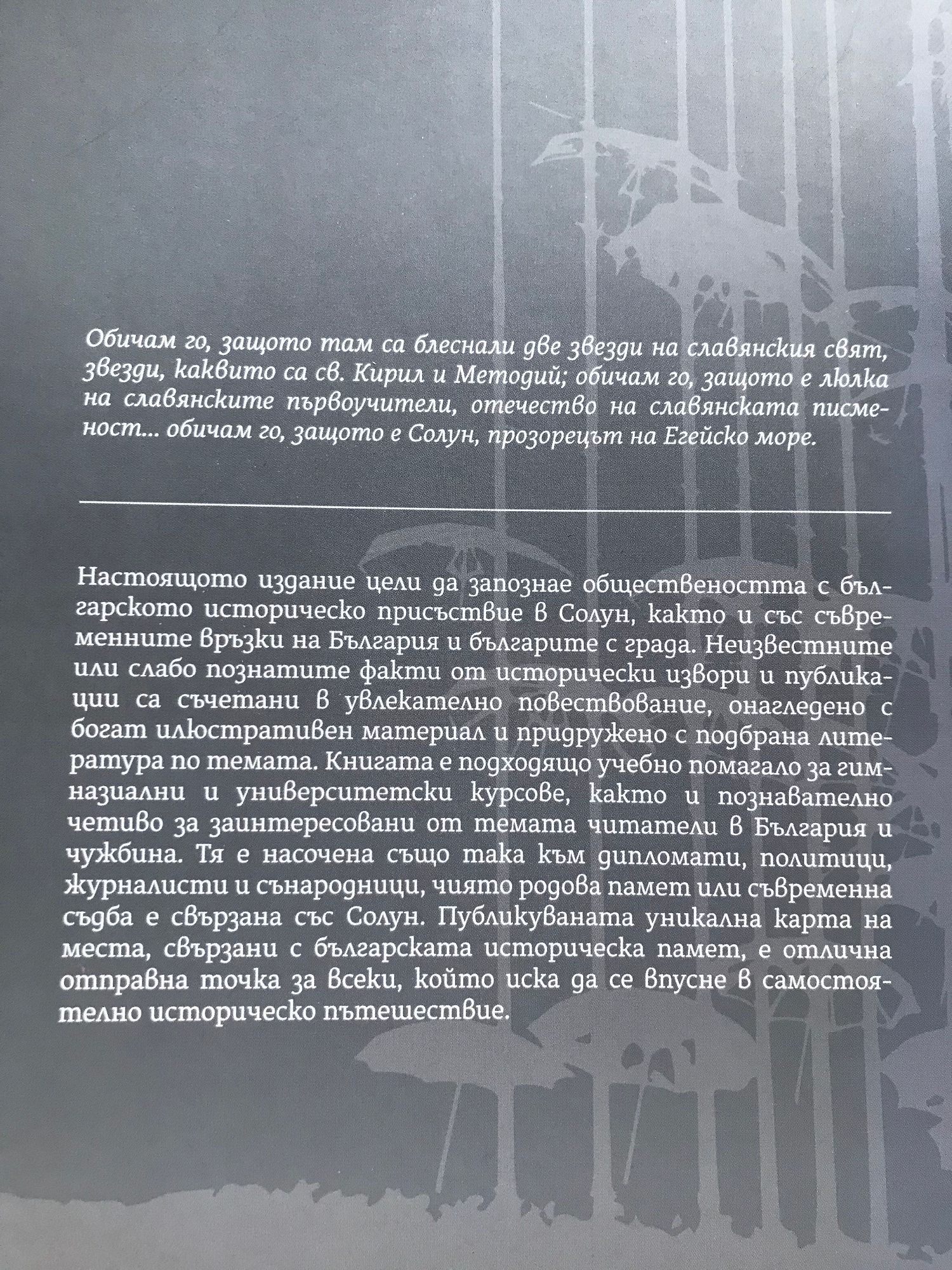 Настоящото издание цели да запознае обществеността с българското историческо присъствие в Солун, както и със съвременните връзки на България и българите с града. Неизвестните или слабо познатите факти от исторически извори и публикации са съчетани в увлекателно повествование, онагледено с богат илюстративен материал и придружено с подбрана литература по темата. Книгата е подходящо учебно помагало за гимназиални и университетски курсове, както и познавателно четиво за заинтересовани от темата читатели в България и чужбина. Тя е насочена също така към дипломати, политици, журналисти и сънародници, чиято родова памет или съвременна съдба е свързана със Солун. Публикуваната уникална карта на места, свързани с българската историческа памет, е отлична отправна точка за всеки, който иска да се впусне в самостоятелно историческо пътешествие.