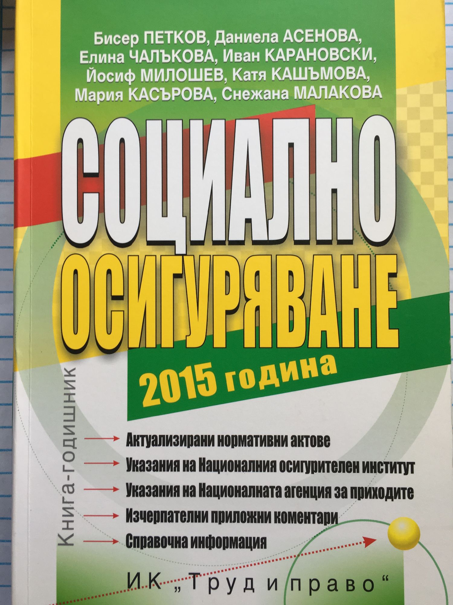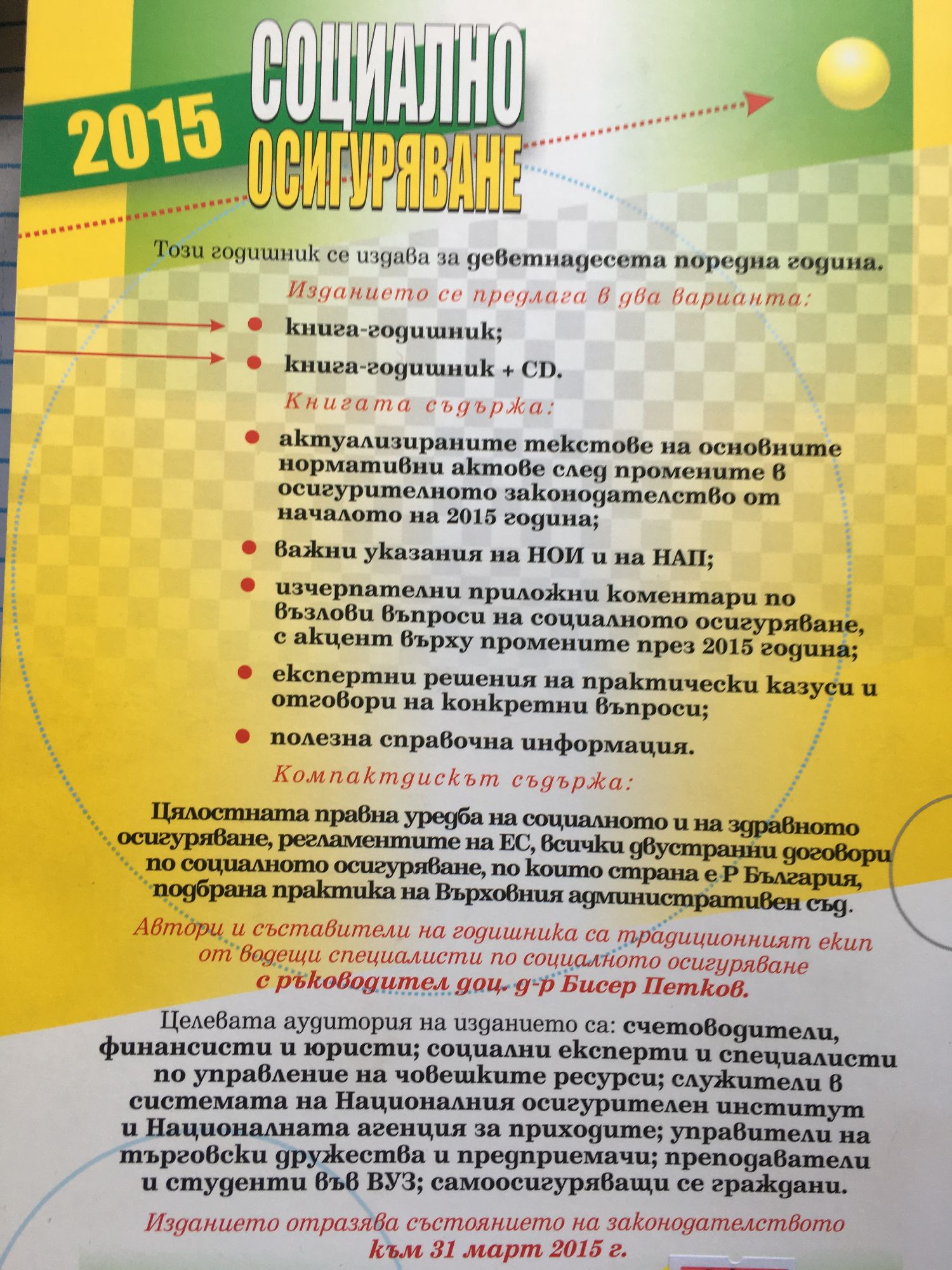 Книгата съдържа: актуализираните текстове на основните нормативни актове след промените в осигурителното законодателство от началото на 2015 година; важни указания на НОИ и на НАП; изчерпателни приложни коментари по възлови въпроси на социалното осигуряване, с акцент върху промените през 2015 година; експертни решения на практически казуси и отговори на конкретни въпроси; полезна справочна информация. Целевата аудитория: счетоводители, финансисти и юристи; социални експерти и специалисти по управление на човешките ресурси; служители в системата на Националния осигурителен институт и Националната агенция за приходите; управители на търговски дружества и предприемачи; преподаватели и студенти във ВУЗ; самоосигуряващи се граждани.