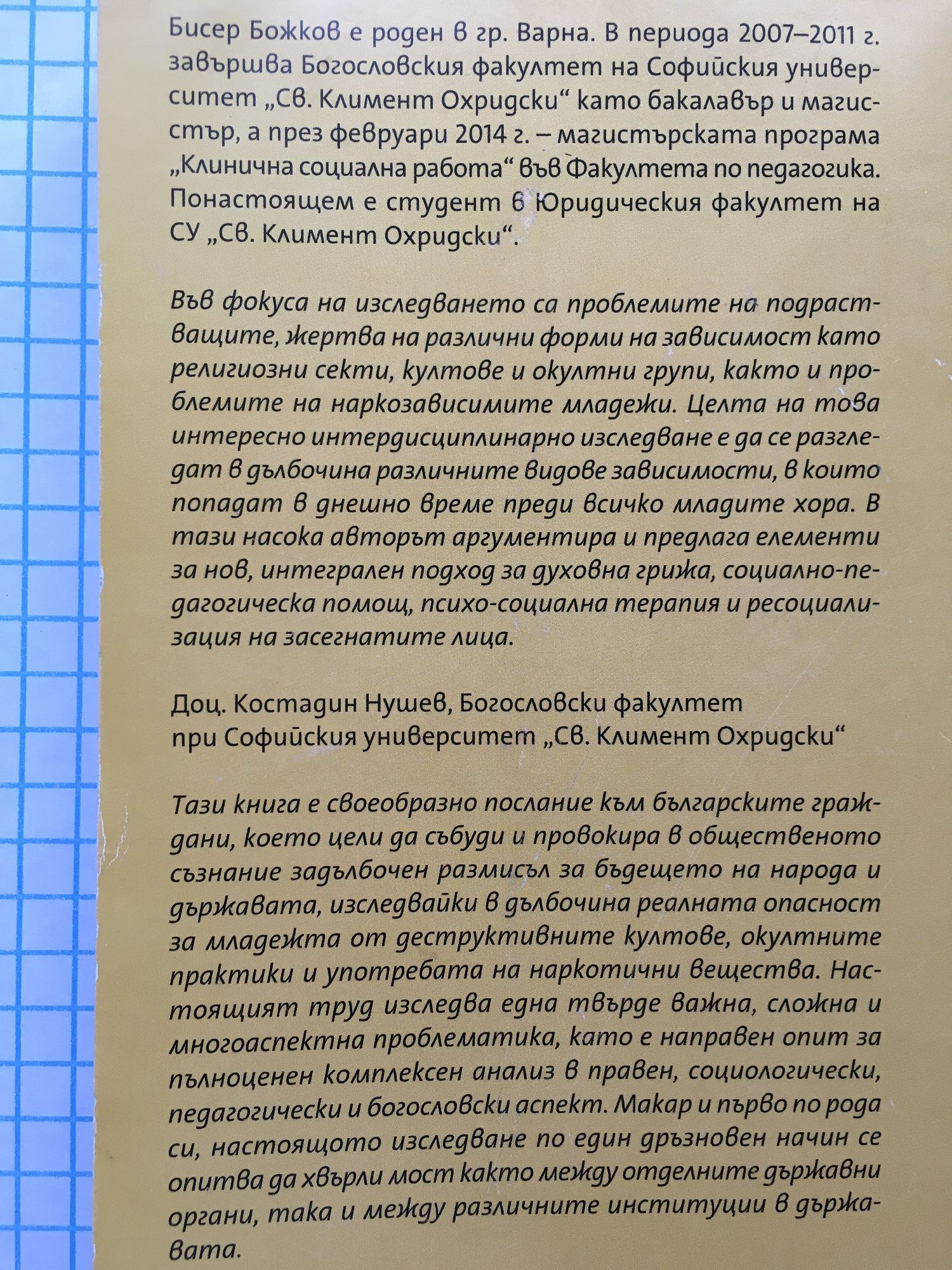 Бисер Божков е роден 6 гр. Варна. В периода 2007-2011 г. завършва Богословския факултет на Софийския университет „Св. Климент Охридски" като бакалавър и магистър, а през февруари 2014 г. - магистърската програма „Клинична социална работа" във Факултета по педагогика. Понастоящем е студент в Юридическия факултет на СУ „Св. Климент Охридски". "Във фокуса на изследването са проблемите на подрастващите, жертва на различни форми на зависимост като религиозни секти, култове и окултни групи, както и проблемите на наркозависимите младежи. Целта на това интересно интердисциплинарно изследване е да се разгледат в дълбочина различните видове зависимости, в които попадат в днешно време преди всичко младите хора. В тази насока авторът аргументира и предлага елементи за нов, интегрален подход за духовна грижа, социално-педагогическа помощ, психо-социална терапия и ресоциализация на засегнатите лица." Доц. Костадин Нушев, Богословски факултет при Софийския университет „Св. Климент Охридски" "Тази книга е своеобразно послание към българските граждани, което цели да събуди и провокира в общественото съзнание задълбочен размисъл за бъдещето на народа и държавата, изследвайки в дълбочина реалната опасност за младежта от деструктивните култове, окултните практики и употребата на наркотични вещества. Настоящият труд изследва една твърде важна, сложна и многоаспектна проблематика, като е направен опит за пълноценен комплексен анализ в правен, социологически, педагогически и богословски аспект. Макар и първо по рода си, настоящото изследване по един дръзновен начин се опитва да хвърли мост както между отделните държавни органи, така и между различните институции в държавата." Емил Дангов юрист и магистър по теология