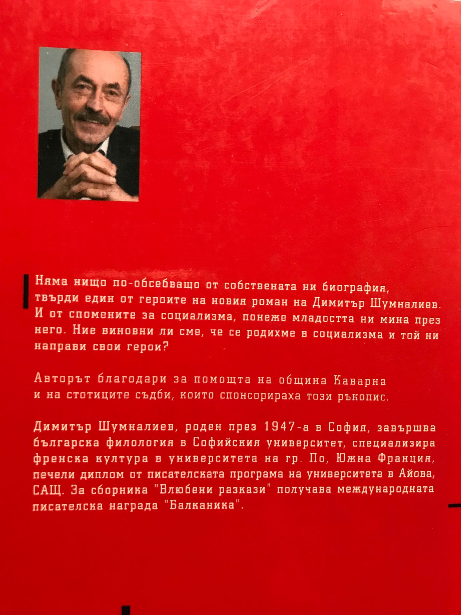 Няма нищо по-обсебващо от собствената ни инфорамация, твърди един от героите на новия роман на Димитър Шумналиев. И от спомените за социализма, понеже младостта ни мина през него. Ние виновни ли сме, че се родихме в социализма и той ни направи свои герои. Димитър Шумналиев, роден през 1947 г. в София, завършва българска филология в СУ, специализира френска култура в университета на гр. По, Южна Франция, печели диплом от писателската програма на университета в Айова, САЩ. За сборника „Влюбени разкази” получава международната писателска награда "Балканика".