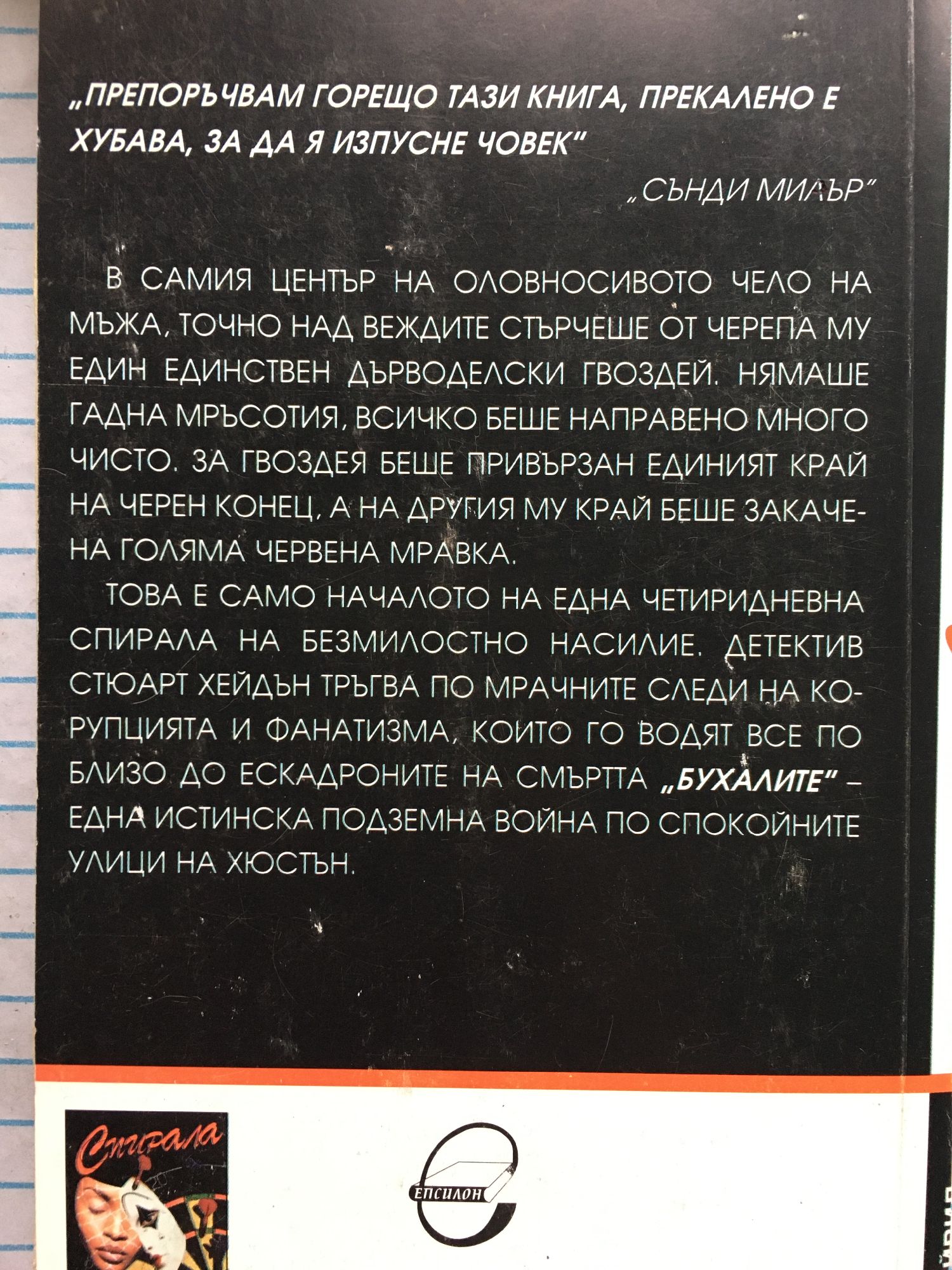 „Препоръчвам горещо тази книга, прекалено е хубава, за да я изпусне човек.“ Сънди Милър В самия център на оловносивото чело на мъжа, точно над веждите стърчеше от черепа му един-единствен дърводелски гвоздей. Нямаше гадна мръсотия, всичко беше направено много чисто. За гвоздея беше привързан единият край на черен конец, а на другия му край беше закачена голяма червена мравка.