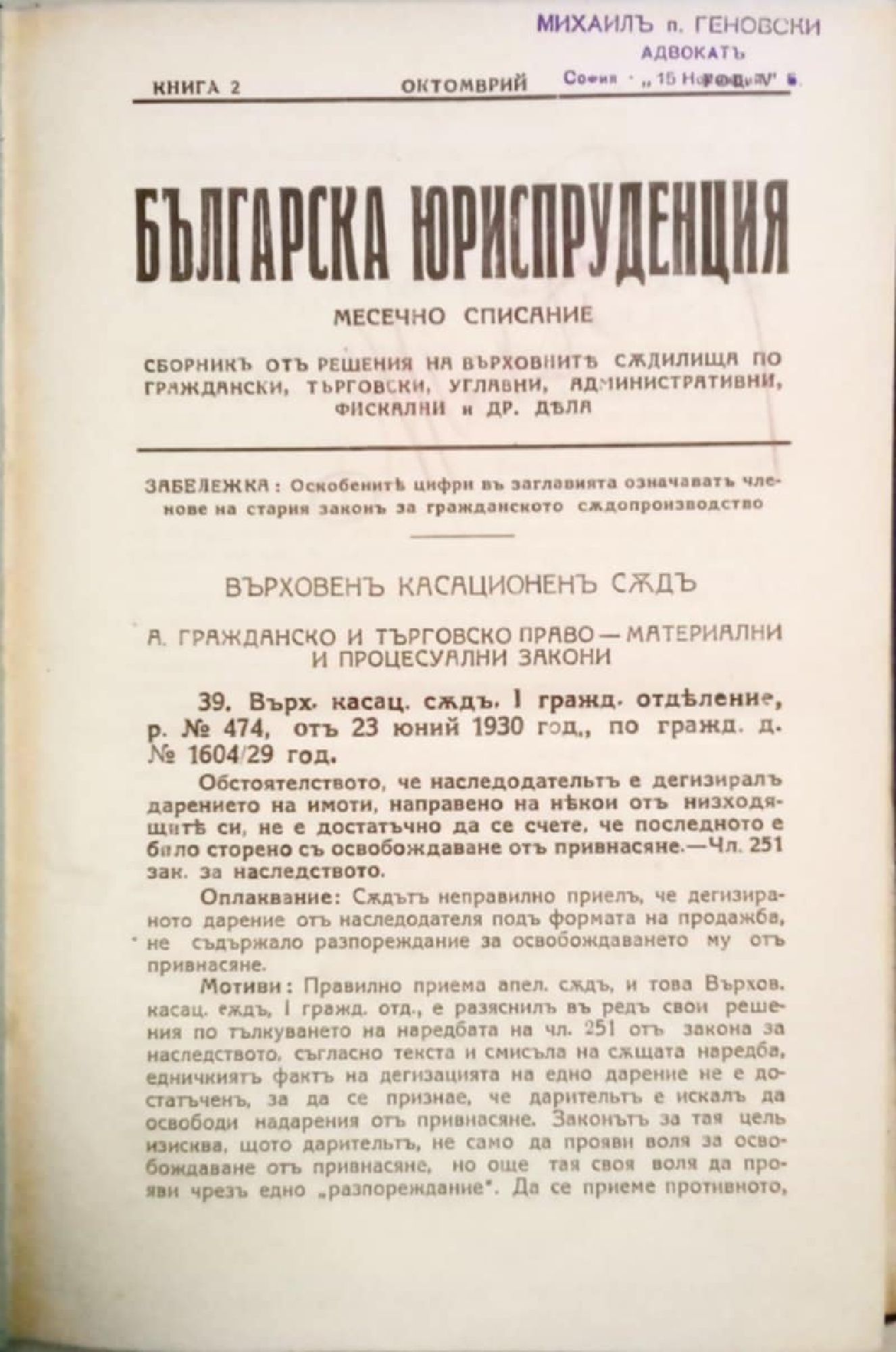Месечно списание. Сборникъ отъ решения на върховните съдилища по граждански, търговски, углавни, административни, фискални и др. дела