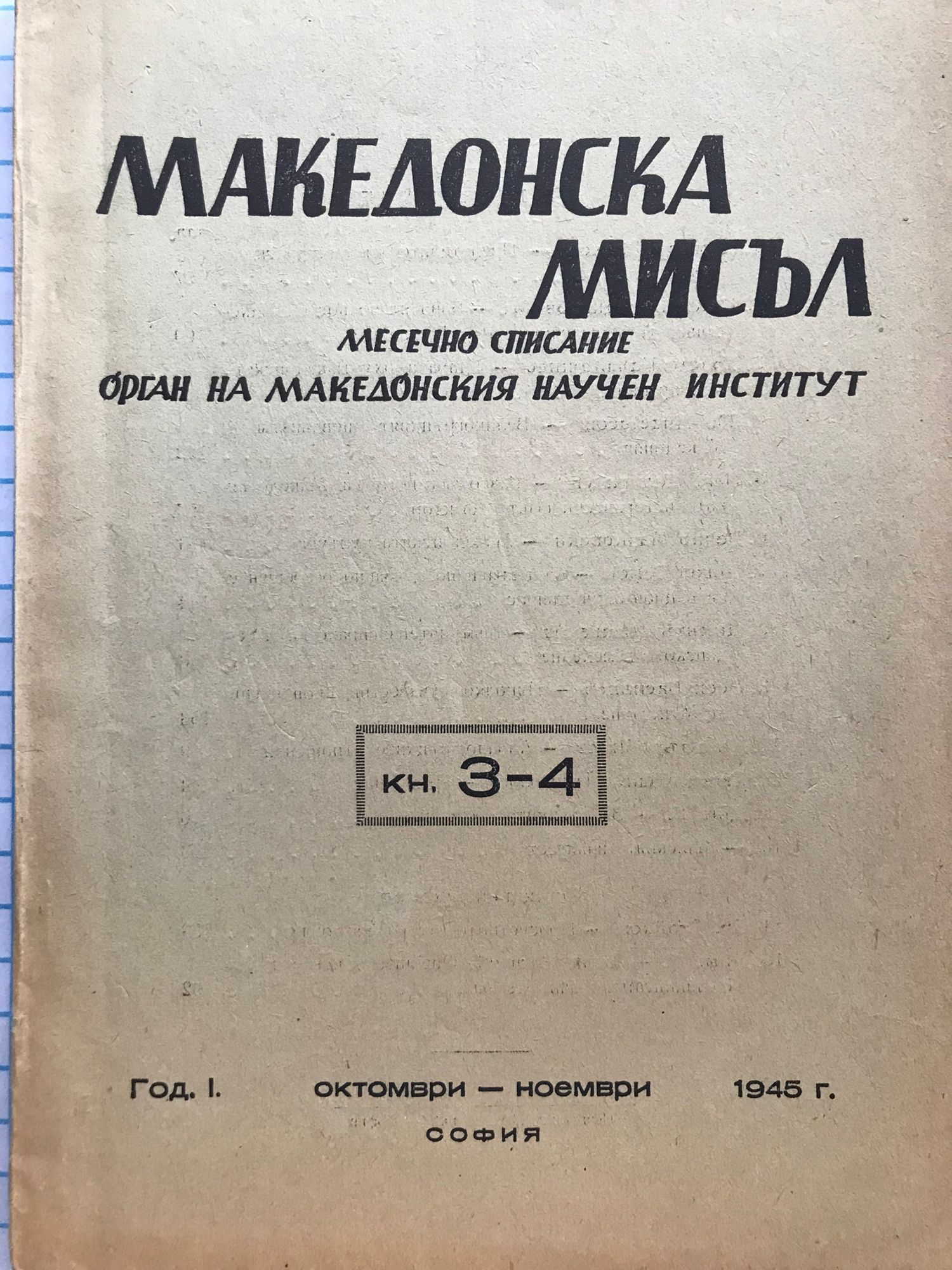 Списание "Македонска мисъл" - год. I (1), кн. 3 - 4, октомври - ноември 1945 г.