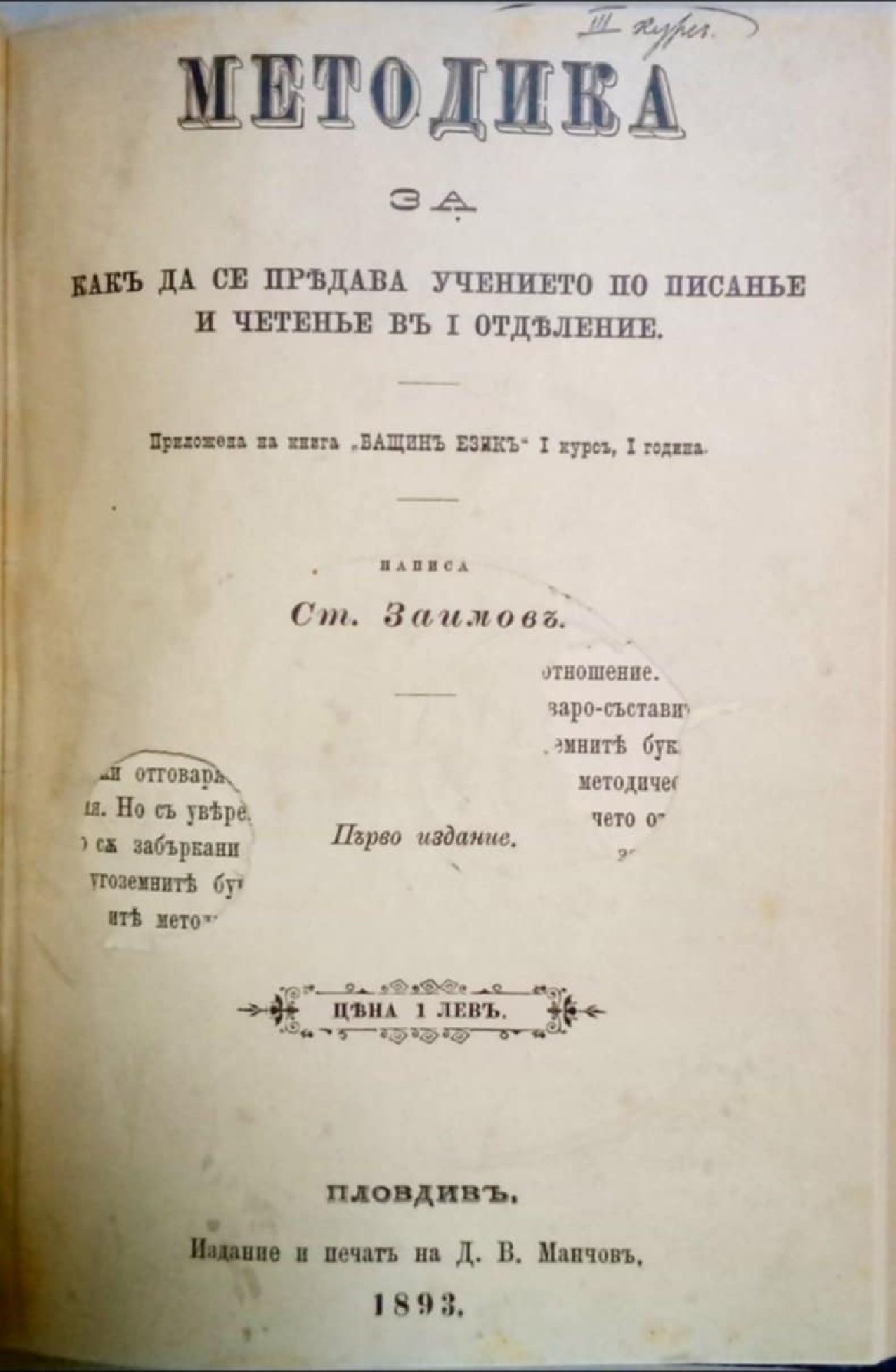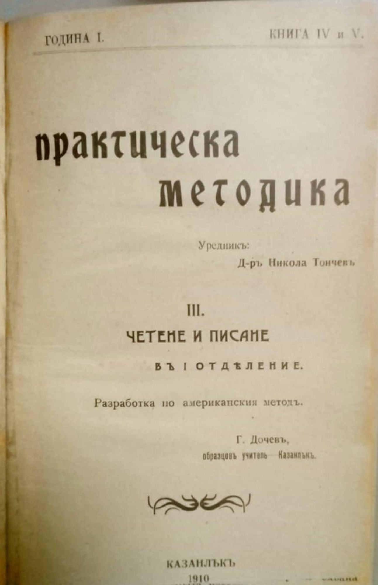 Конволют от четири антикварни книги и списание по методика на обучението в училищата: 1. Списание "Практическа методика на предметите въ (в) основното училище" - год. 1, кн. 4-5, Казанлък, 1910, 192 с. 2. С. Чакъров, М. Господинов. Методика на езикознанието. Ч. 2. Говоръ и четене. Кюстендил, 1907, 160 с. 3. Ст. Заимов. Методика как да се предава учението по писане и четене въ 1. отделение. Пловдив, 1893, 74 с. 4. Кл. Карагюлов. Ръководство по четението въ (в) долните класове. Теория и практика. Пловдив, 1910, 140 с.