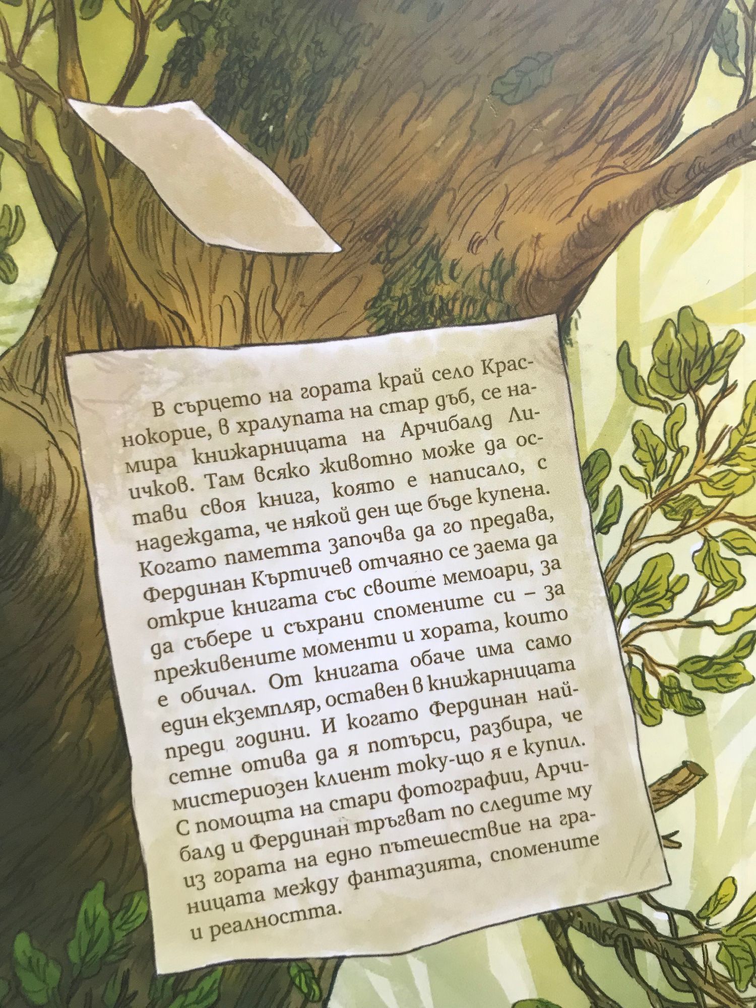 В сърцето на гората край село Краснокорие, в хралупата на стар дъб, се намира книжарницата на Арчибалд Лисичков. Там всяко животно може да остави своя книга, която е написало, с надеждата, че някой ден ще бъде купена. Когато паметта започва да го предава, Фердинан Къртичев отчаяно се заема да открие книгата със своите мемоари, за да събере и съхрани спомените си – за преживените моменти и хората, които е обичал. От книгата обаче има само един екземпляр, оставен в книжарницата преди години. И когато Фердинан най-сетне отива да я потърси, разбира, че мистериозен клиент току-що я е купил. С помощта на стари фотографии, Арчибалд и Фердинан тръгват по следите му из гората на едно пътешествие на границата между фантазията, спомените и реалността.
