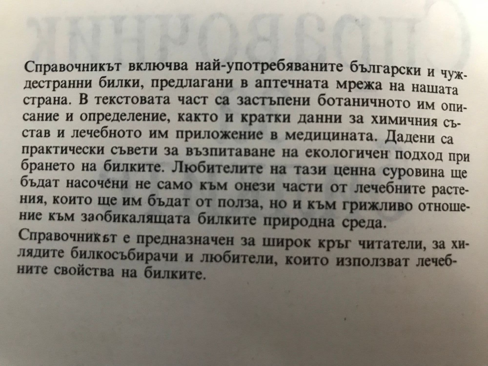 Справочникът включва най-употребяваните български и чуждестранни билки, предлагани в аптечната мрежа на нашата страна. В текстовата част са застъпени ботаничното им описание и определение, както и кратки данни за химичния състав и лечебното им приложение в медицината. Дадени са практически съвети за възпитаване на екологичен подход при брането на билките. Любителите на тази ценна суровина ще бъдат насочени не само към онези части от лечебните растения, които ще им бъдат от полза, но и към грижливо отношение към заобикалящата билките природна среда. Справочникът е предназначен за широк кръг читатели, за хилядите билкосъбирачи и любители, които използват лечебните свойства на билките.