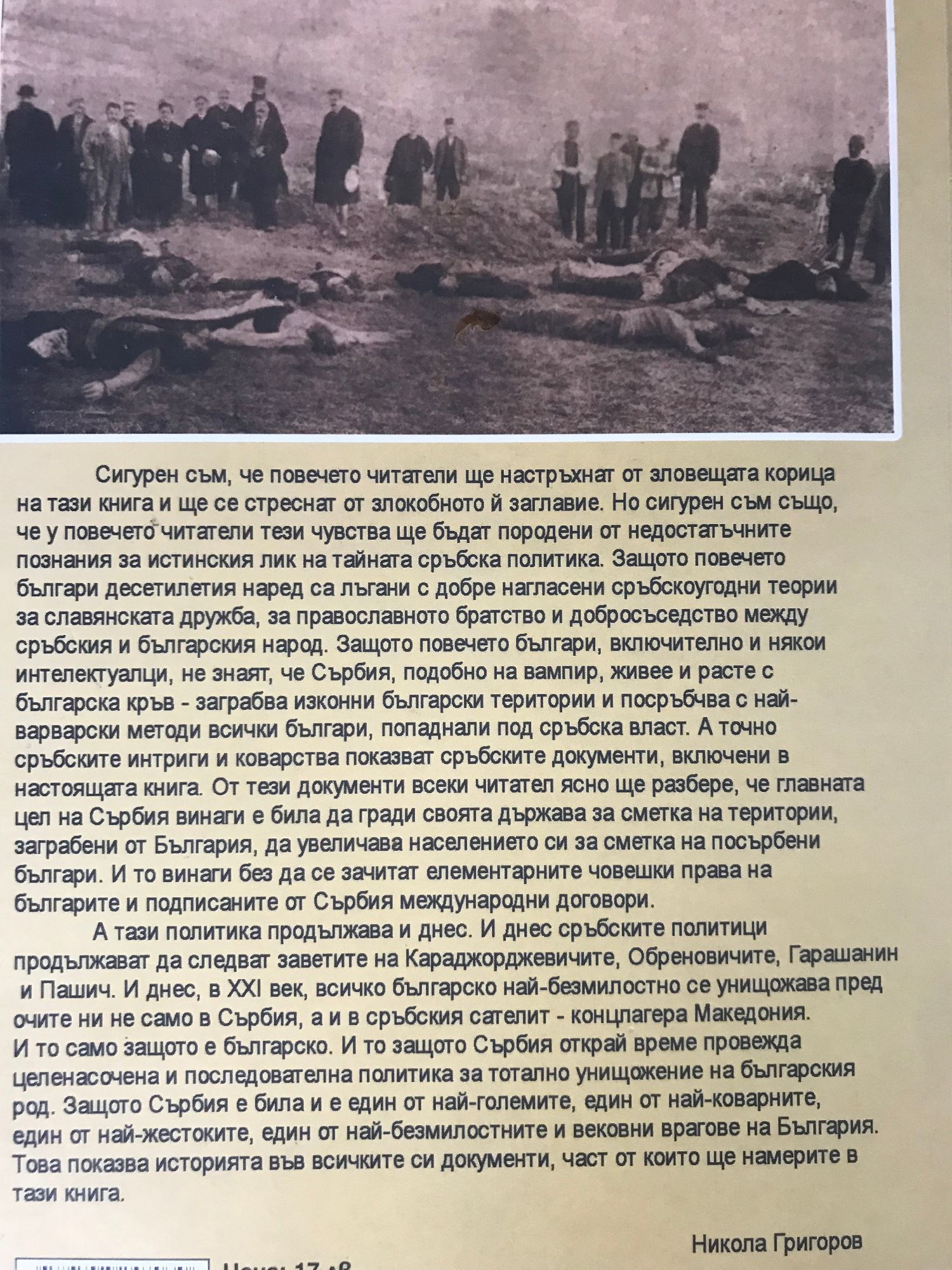 Православие, славянство, добросъседство. "Сигурен съм, че повечето читатели ще настръхнат от зловещата корица на тази книга и ще се стреснат от злокобното ѝ заглавие. Но сигурен съм също, че у повечето читатели тези чувства ще бъдат породени от недостатъчните познания за истинския лик на тайната сръбска политика. Защото повечето българи десетилетия наред са лъгани с добре нагласени сръбскоугодни теории за славянската дружба, за православното братство и добросъседството между сръбския и българския народ. Защото повечето българи, включително и някои интелектуалци, не знаят, че Сърбия, подобно на вампир, живее и расте с българска кръв - заграбва изконни български територии и посръбчва с най-варварски методи всички българи, попаднали под сръбска власт. А точно сръбските интриги и коварства показват сръбските документи, включени в настоящата книга. От тези документи всеки читател ясно ще разбере, че главната цел на Сърбия винаги е била да гради своята държава за сметка на територии, заграбени от България, да увеличава населението си за сметка на посърбени българи. И то винаги, без да се зачитат елементарните човешки права на българите и подписаните от Сърбия международни договори. А тази политика продължава и днес. И днес сръбските политици продължават да следват заветите на Караджорджевичите, Обреновичите, Гарашанин и Пашич. И днес, в ХХI век, всичко българско най-безмилостно се унищожава пред очите ни не само в Сърбия, а и в сръбския сателит - концлагера Македония. И то само защото е българско. И то защото Сърбия открай време провежда целенасочена и последователна политика за тотално унищожение на българския род. Защото Сърбия винаги е била и е един от най-големите, един от най-коварните, един от най-жестоките, един от най-безмилостните и вековни врагове на България. Това показва историята във всичките си документи, част, от които ще намерите в тази книга." Никола Григоров