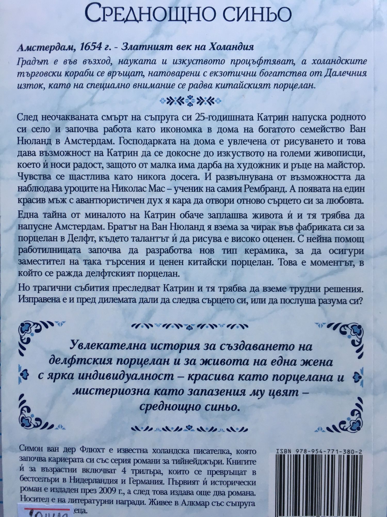 Историята на делфтския порцелан и на една жена с ярка индивидуалност – красива като порцелана и мистериозна като запазения му цвят Амстердам, 1654 г. – Златният век на Холандия. Градът е във възход, науката и изкуството процъфтяват, а холандските търговски кораби се връщат, натоварени с екзотични богатства от Далечния изток, като на специално внимание се радва китайският порцелан. След неочакваната смърт на съпруга си 25-годишната Катрин напуска родното си село и започва работа като икономка в дома на богатото семейство Ван Нюланд в Амстердам. Господарката на дома е увлечена от рисуването и това дава възможност на Катрин да се докосне до изкуството на големи живописци, което й носи радост, защото от малка има дарба на художник и ръце на майстор. Чувства се щастлива като никога досега. И развълнувана от възможността да наблюдава уроците на Николас Мас – ученик на самия Рембранд. А появата на един красив мъж с авантюристичен дух я кара да отвори отново сърцето си за любовта. Една тайна от миналото на Катрин обаче заплашва живота й и тя трябва да напусне Амстердам. Братът на Ван Нюланд я взема за чирак във фабриката си за порцелан в Делфт, където талантът й да рисува е високо оценен. С нейна помощ работилницата започва да разработва нов тип керамика, за да осигури заместител на така търсения и ценен китайски порцелан. Това е моментът, в който се ражда делфтският порцелан. Но трагични събития преследват Катрин и тя трябва да вземе трудни решения. Изправена е и пред дилемата дали да следва сърцето си, или да послуша разума си? Увлекателна история за създаването на делфтския порцелан и за живота на една жена с ярка индивидуалност – красива като порцелана и мистериозна като запазения му цвят – среднощно синьо.