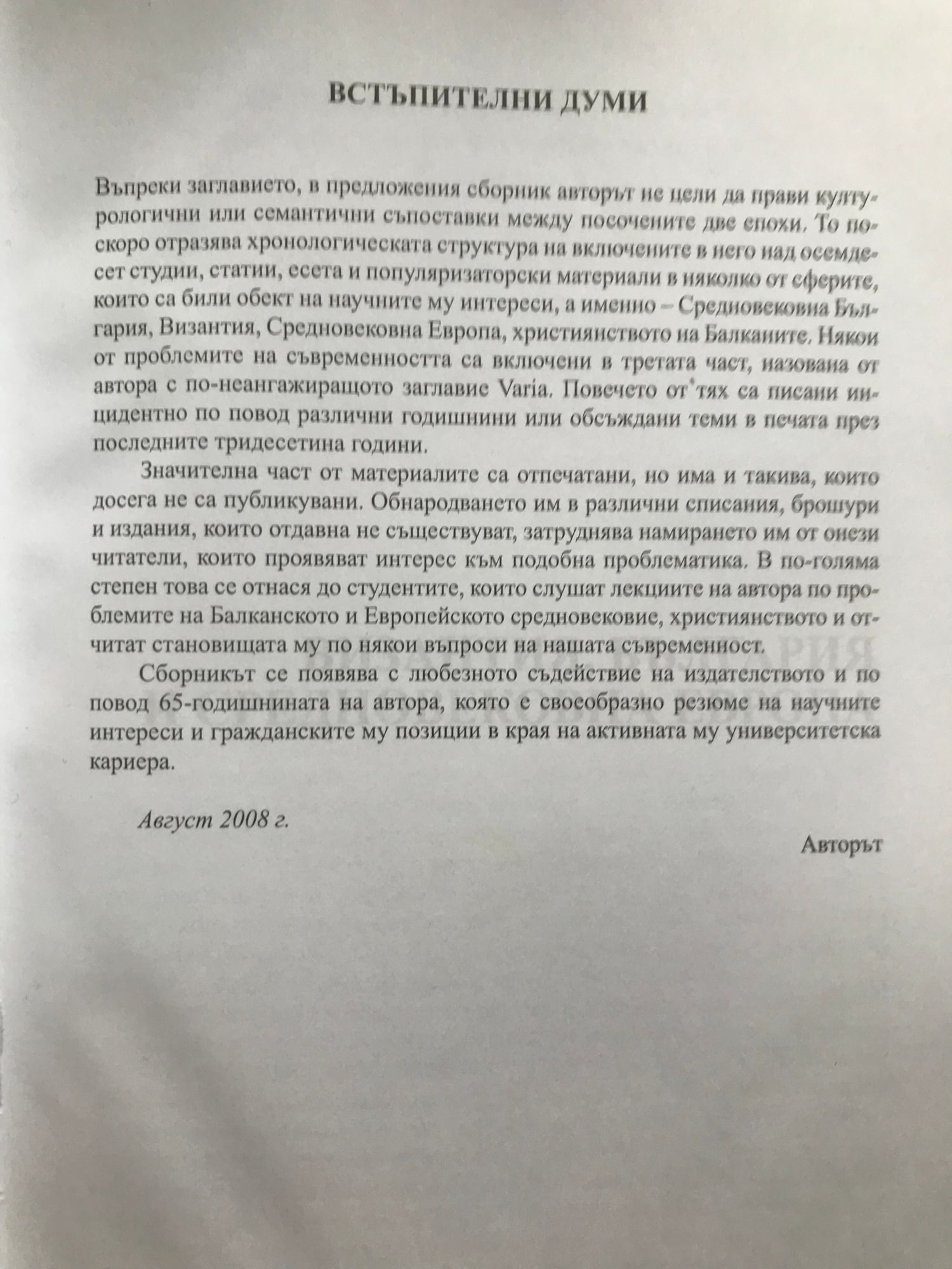 В предложения сборник авторът не цели да прави културологични или семантични съпоставки между посочените две епохи. То по-скоро отразява хронологическата структура на включените в него над осемдесет студии, статии, есета и популяриаторски материали в няколко от сферите, които са били обект на научните му интееси, а именно - Средновековна България, Византия, Средновековна Европа, християнството на Балканите. Някои от проблемите на съвременността са включени в третата част на книгата. Ровечето от тях са писани инцидентно по повод различни годишнини или обсъждани теми в печата през последните тридесетина години. Значителна част от материалите са отпечатани, но има и такива, които досега не са публикувани. Сборникът се появява по повод 65-годишнината на автора, което е своеобразно резюме на научните интереси и гражданските у позиции в края на активната му университетска кариера