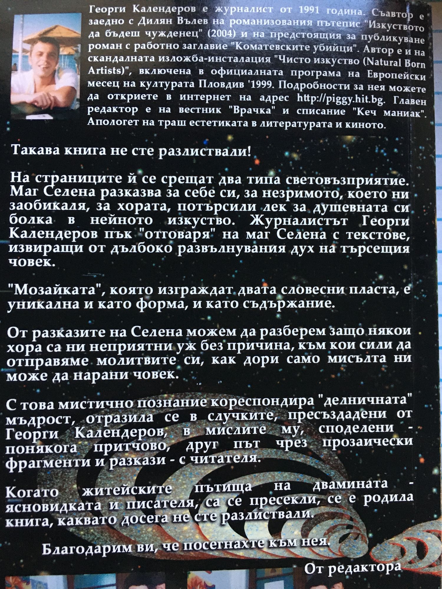 Такава книга не сте разлиствали! На страниците й се срещат два типа световъзприятие. Маг Селена разказва за себе си, за незримото, което ни заобикаля, за хората, потърсили лек за душевната си болка в нейното изкуство. Журналистът Георги Календеров пък "отговаря" на маг Селена с текстове, извиращи от дълбоко развълнувания дух на търсещия човек. "Мозайката", която изграждат, двата словесни пласта, е уникална и като форма, и като съдържание. От разказите на Селена можем да разберем защо някои хора са ни неприятни уж без причина, към кои сили да отправяме молитвите си, как дори само мисълта ни може да нарани човек. С това мистично познание кореспондира "делничната" мъдрост, отразила се в случките, пресъздадени от Георги Календеров, в мислите му, споделени - понякога притчово, друг път чрез прозаически фрагменти и разкази - с читателя. Когато житейските пътища на двамината - ясновидката и писателя, са се пресекли, се е родила книга, каквото досега не сте разлиствали.