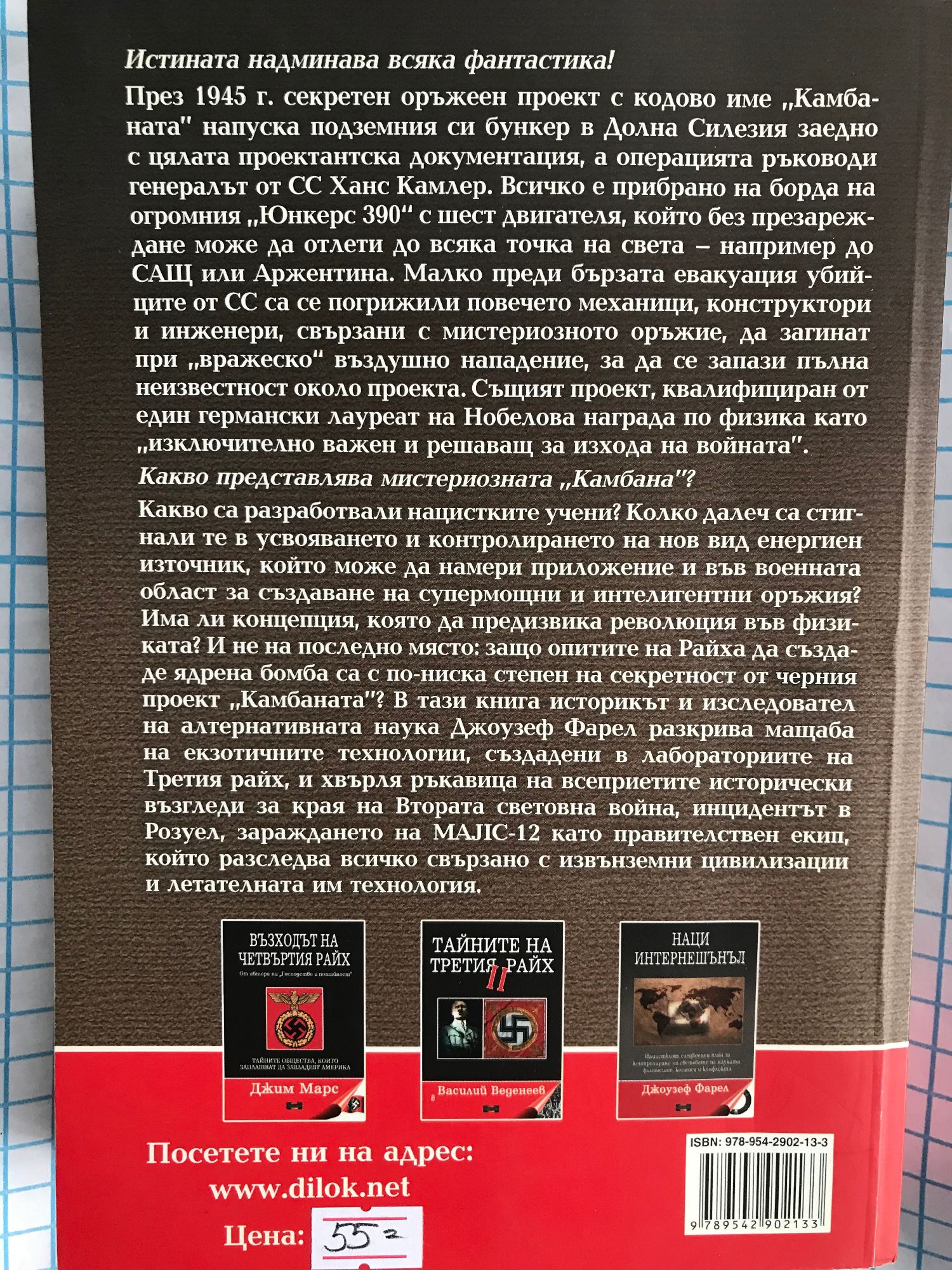 През 1945 г. секретен оръжеен проект с кодово име "Камбаната" напуска подземния ни бункер в Долна Силезия заедно с цялата проектантска документация, а операцията ръководи генералът от СС Ханс Камлер. Всичко е прибрано на борда на огромния "Юнкерс 390" с шест двигателя, който без презареждане може да отлети до всяка точка на света - например до САЩ или Аржентина. Малко преди бързата евакуация убийците от СС са се погрижили повечето механици, конструктори и инженери, свързани с мистериозното оръжие, да загинат при "вражеско" въздушно нападение, за да се запази пълна неизвестност около проекта. Същият проект, квалифициран от един германски лауреат на нобелова награда по физика като "изключително важен и решаващ за изхода на войната". Какво представлява мистериозната "Камбана"? Какво са разработвали нацистките учени? Колко далеч са стигнали те в усвояването и контролирането на нов вид енергиен източник, който може да намери приложение и във военната област за създаване на супермощни и интелигентни оръжия? Има ли концепция, която да предизвика революция във физиката? И не на последно място: защо опитите на Райха да създаде ядрена бомба са с по-ниска степен на секретност от черния проект "Камбаната"? В тази книга историкът и изследовател на алтернативната наука Джоузеф Фарел разкрива мащаба на екзотичните технологии, създадени в лабораториите на Третия райх, и хвърля ръкавица на всеприетите исторически възгледи за края на Втората световна война, инцидентът в Розуел, зараждането на MAJIC-12 като правителствен екип, който разследва всичко свързано с извънземни цивилизации и летателната им технология.