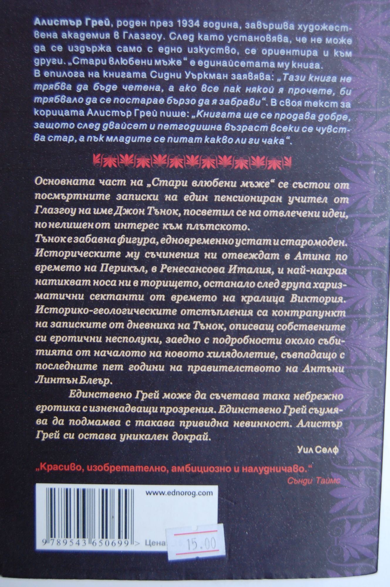 Основната част на „Стари влюбени мъже“ се състои от посмъртните записки на един пенсиониран учител от Глазгоу на име Джон Тьнок, посветил се на отвлечени идеи, но нелишен от интерес към плътското. Тьнок е забавна фигура, едновременно устат и старомоден. Историческите му съчинения ни отвеждат в Атина по времето на Перикъл, в Ренесансова Италия, и най-накрая натикват носа ни в торището, останало след група харизматични сектанти от времето на кралица Виктория. Историко-геологическите отстъпления са контрапункт на записките от дневника на Тьнок, описващ собствените си еротични несполуки, заедно с подробности около събитията от началото на новото хилядолетие, съвпадащо с последните пет години на правителството на Антъни Линтън Блеър. Единствено Грей може да съчетава така небрежно еротика с изненадващи прозрения. Единствено Грей съумява да подмамва с такава привидна невинност. Алистър Грей си остава уникален докрай. УилСелф